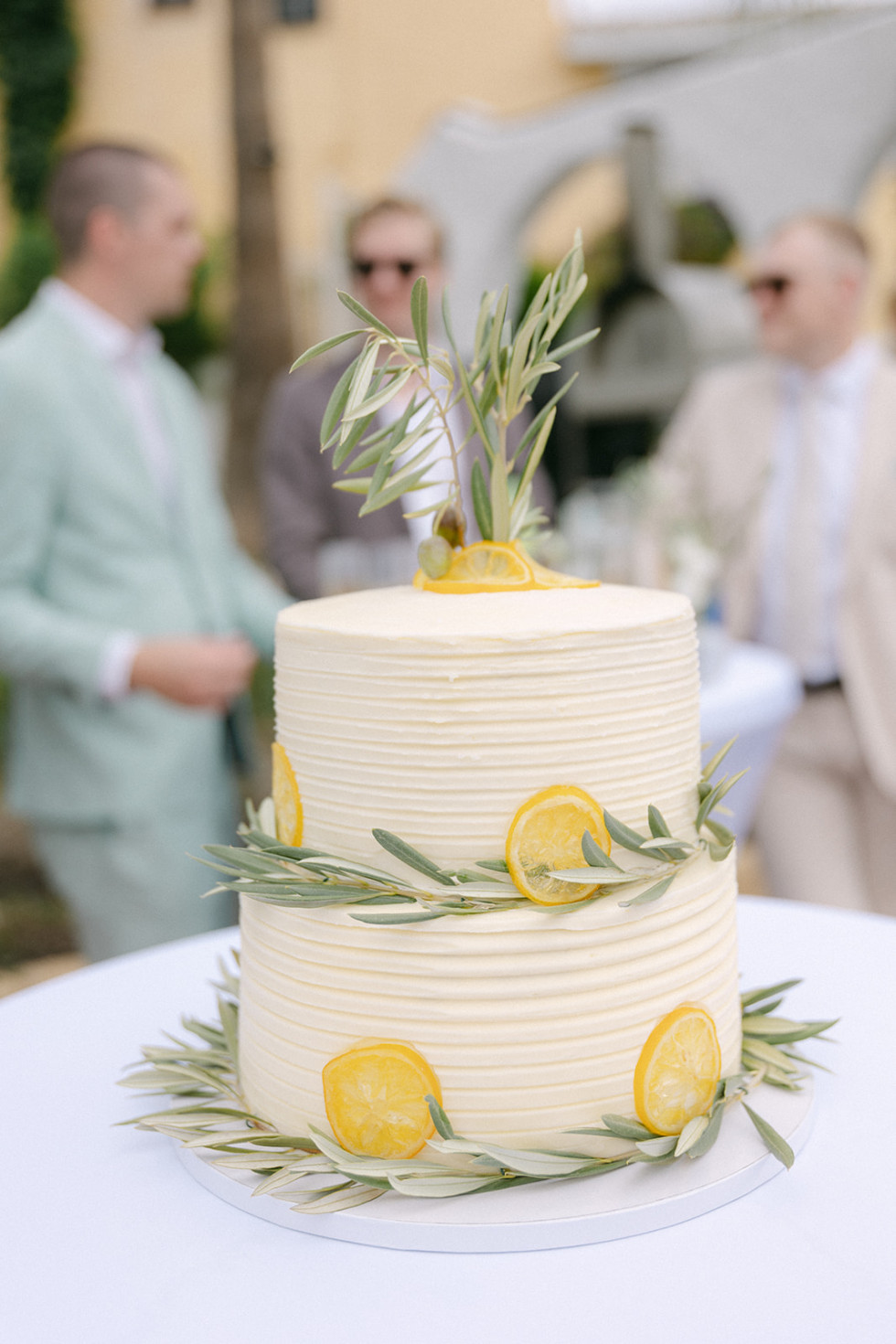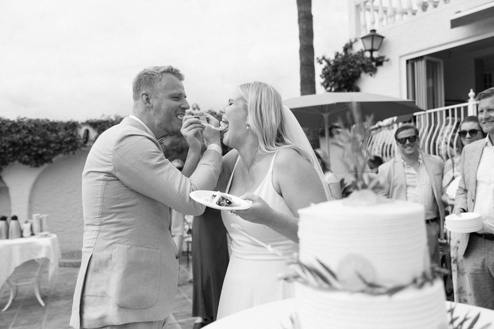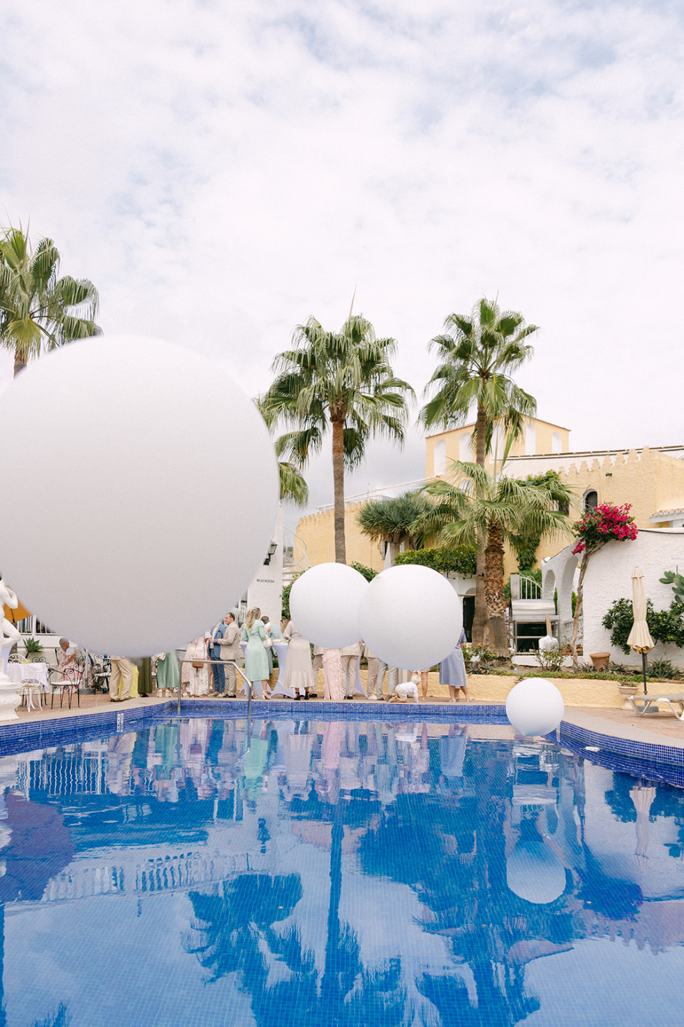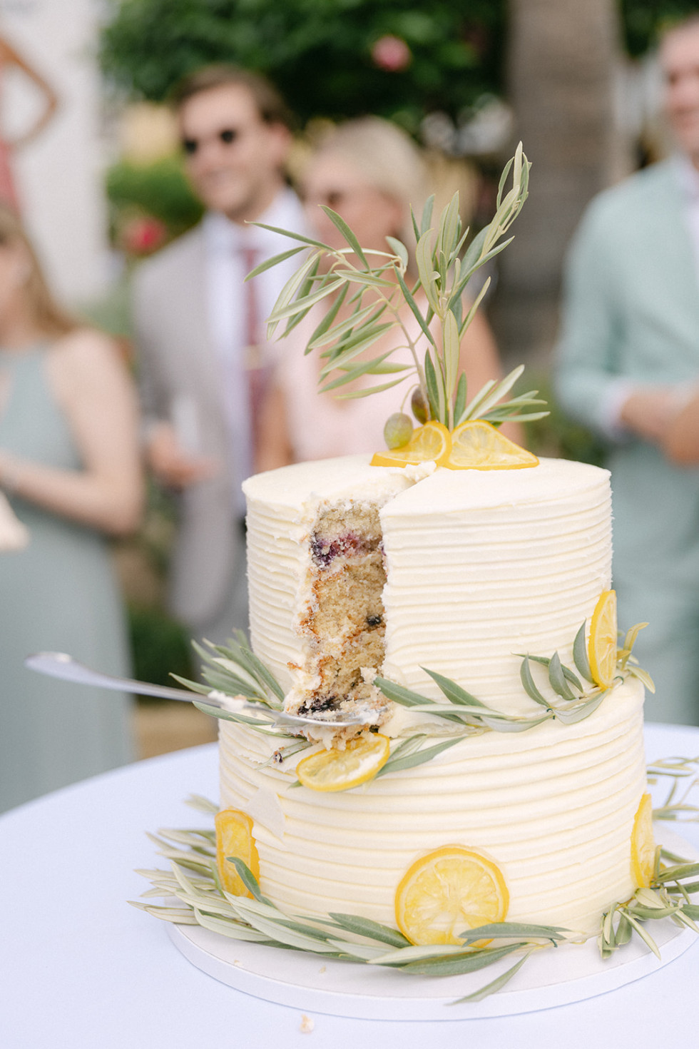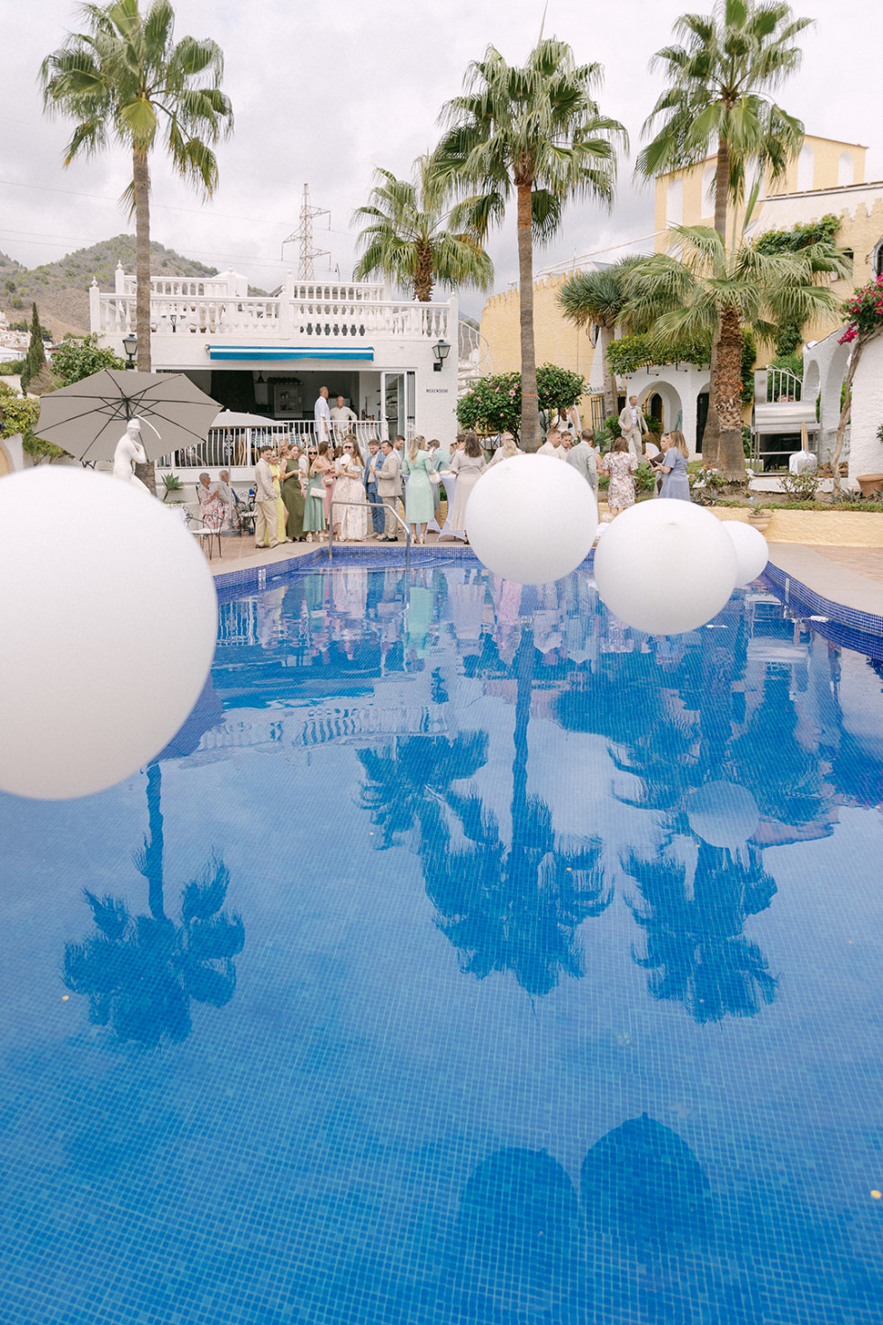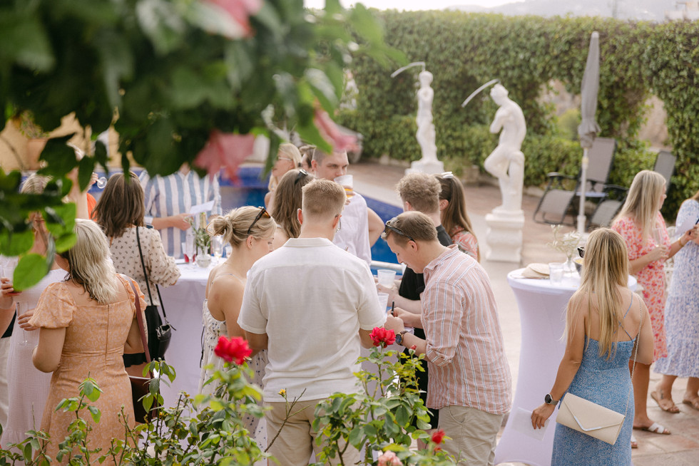 Efter vigseln övergick vi till mingel och bröllopstårta vid poolen. De blev succé, många gäster blev glada för en kopp kaffe på eftermiddagen! Tårtan var i smak av hallon och blåbär med en citronsmörkräm. Efter tårtan höjdes musiken något och vi serverade aperol spritz. Här hade vi även lite aktiviteter som exempelvis en gästbok med polaroidkamera och en fotovägg.