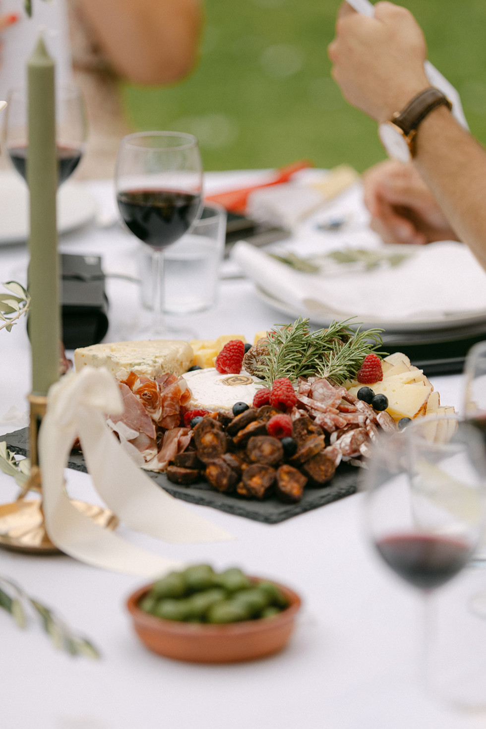 Vår bröllopsmeny bestod av flera olika rätter med asiatisk inspiration. Vi båda älskar mat, de är en stor del av vårt liv, så vi la mycket omtanke på bröllopsmiddagen. Middagen började med en ost och charkbricka som vi under många månader har provat och testat oss fram för att hitta de allra bästa. Vi har testat MÅNGA ostar och många oliver för att hitta rätt.