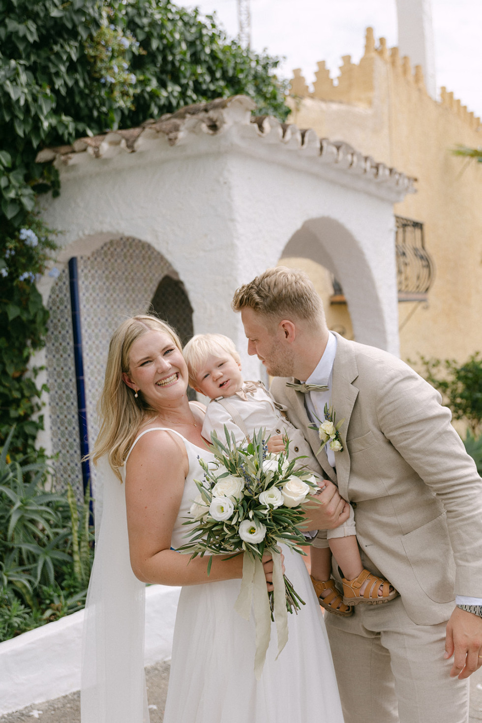 Lovisa hade en bröllopsklänning från Ivory and Grace. Jag valde en enkel klänning men med släp, jag var tvungen att ha något som fungerade även om det blev 30 grader varmt! En lång slöja från samma märke med några diskreta små utspridda vita pärlor. Beigea skor med rosett, från Flattered. Örhängen från Enamel Copenhagen. Lånat halsband av min farmor. Vår son Ralph hade en vit skjorta med en liten fluga och beigea byxor ifrån Newbie.