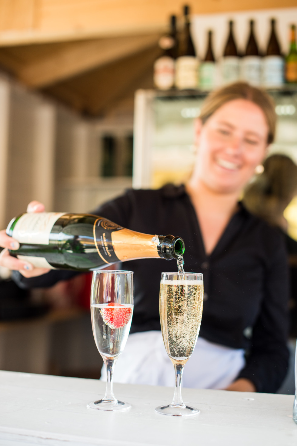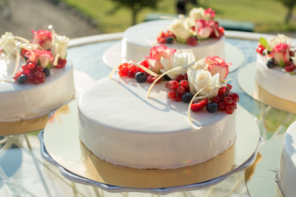 Bröllopstårta: Gjord av Körundas egna konditor, Andrea Olsson. En vitglacerad sommartårta, dekorerad med rosor och bär.