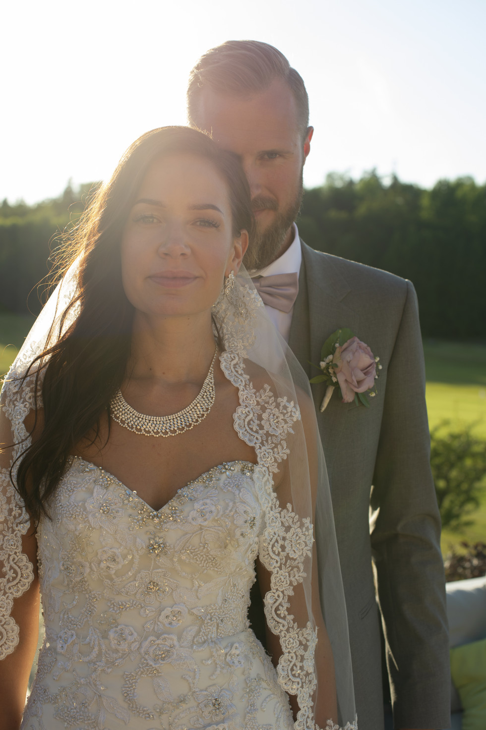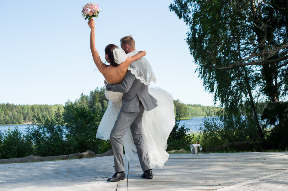 i början av planeringen hade vi inte tänkt så mycket på fotograferingen. Men vi hade fått tag på världens bästa Kristin Andersson ”Kicki fotograf”. Vi hade så roligt med henne och hon lyckades fånga hela dagen från förberedelserna till kvällens solnedgång. Jag måste säga att en bra fotograf är ett måste när man gifter sig, för det är i bilderna alla minnen finns kvar. Under en cykelrunda hade Niklas redan sett ut en vacker plats, som han visade för Kicki. En liten kärleksbro som ligger en bit in i skogen vid sjön Muskan, intill Körunda. Dit fick jag gå med mina höga sidenklackar, poserandes genom trädens grönska. Det var bland det roligaste på hela dagen och vi fick till otroligt vackra konstverk. Vi fortsatte fotograferingen med bubbel och dans på ett trädäck vid sjön.