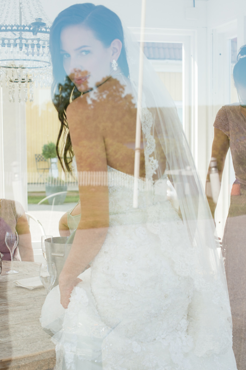 Mingel och brudskål blev på verandan i solen. Det var så varmt, så gästerna hade redan svalkat sig med goda drinkar ute i baren. Hög musik och en härlig avslappnad stämning innan det var dags för middag. Runda bord var dukade och dekorerade med vackra sommarblommor i små vaser.Våra toastmadams hade planerat middagen så bra. En blandning av fina tal och roliga lekar. Maten var fantastisk, alla gästerna berömde köket för den goda maten. Så vackra tallrikar och smakerna som passande så bra med de valda vinerna. Servicen var på topp och middagen kunde inte blivit bättre. I lobbyn serverades bröllopstårtan på en vacker flygel. Sedan blev det bröllopsvals till ”you are the reason”. Där dansade vi vidare hela kvällen lång. Det som var toppen var att alla gäster kunde känna sig som hemma. De äldre gick och la sig medan vi andra festade på tills baren stängde. Ingen behövde säga hejdå eller passa någon taxi hem. Dagen efter var vi alla lite slitna. Vi avslutade helgen med en gemensam frukost och öppnade alla fina bröllopsgåvor. Läste alla fina kort och telegram och grät några lyckliga tårar till.