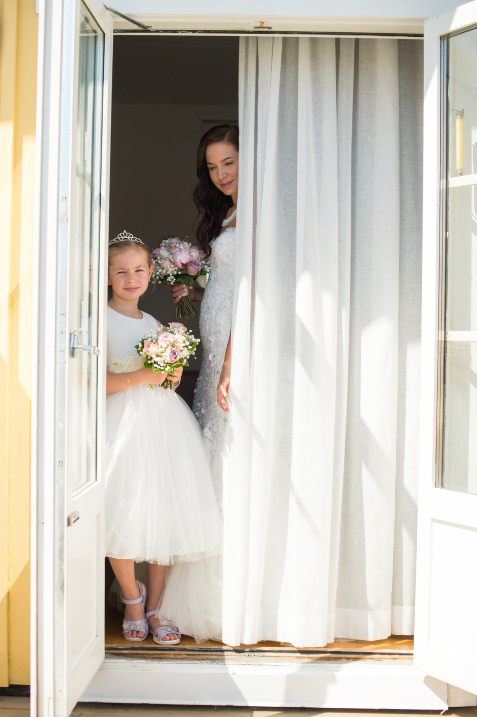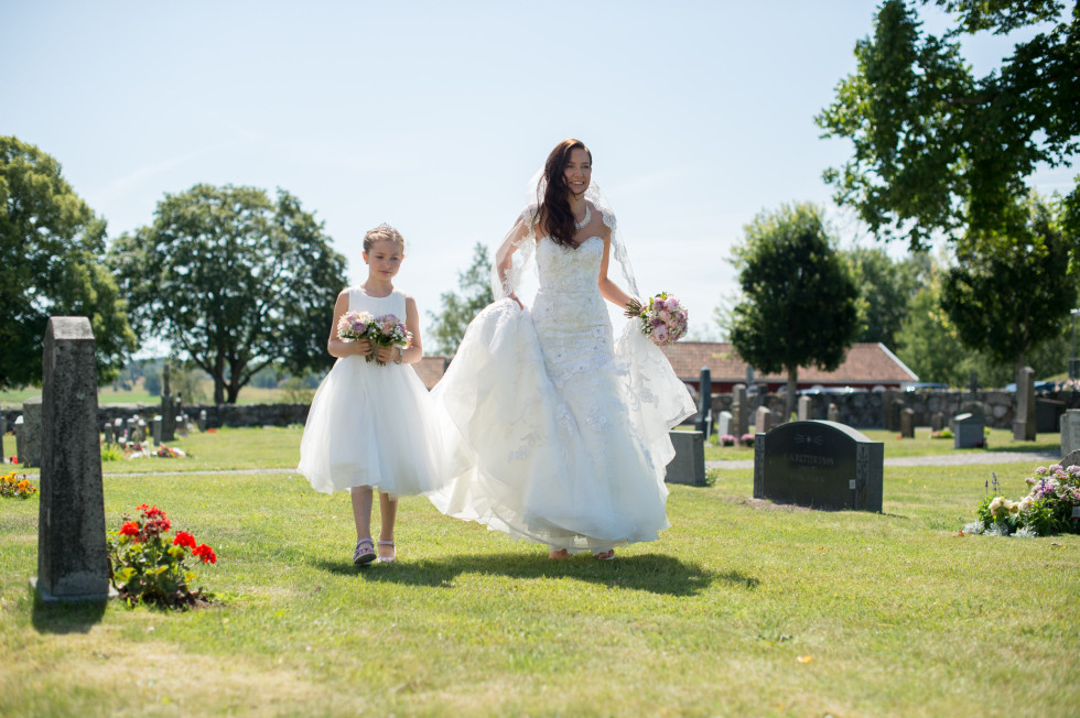 Jag och Vilma hade en mysig frukost och fick sedan hår och smink fixat på hotellet. Vi kände oss konstigt nog väldigt lugna och kunde bara njuta av dagen. Allt var nu klart, klänningen satt perfekt och till och med vädret var på topp. Iväg åkte vi till Sorunda kyrka, en av Sveriges äldsta och vackraste kyrkor. Vid altaret stod Niklas med sina två bröder vid sin sida. Först gick min bästa vän och vår dotter Vilma in, sedan mina två systrar. Jag ser Niklas, vänner och familj som är där för att dela vår lycka, det är en obeskrivlig kärlek som värms i hela kroppen när man går mot altaret. Även solisten sjöng som en ängel. Vi valde att ha två låtar under ceremonin. ”how long will I love you” av Ellie Goulding och ”du är allt” av Sonja Aldén. Utanför kyrkan kastades det rosenblad och small konfetti. Barnen sprang runt och blåste såpbubblor, vilket gav väldigt fina bilder. Vi åkte tillbaka till Körunda för fotografering, medan gästerna checkade in på hotellet, hade tipspromenad och lärde känna varandra.