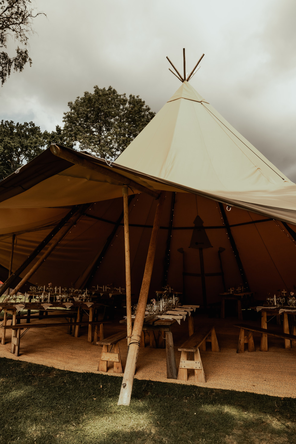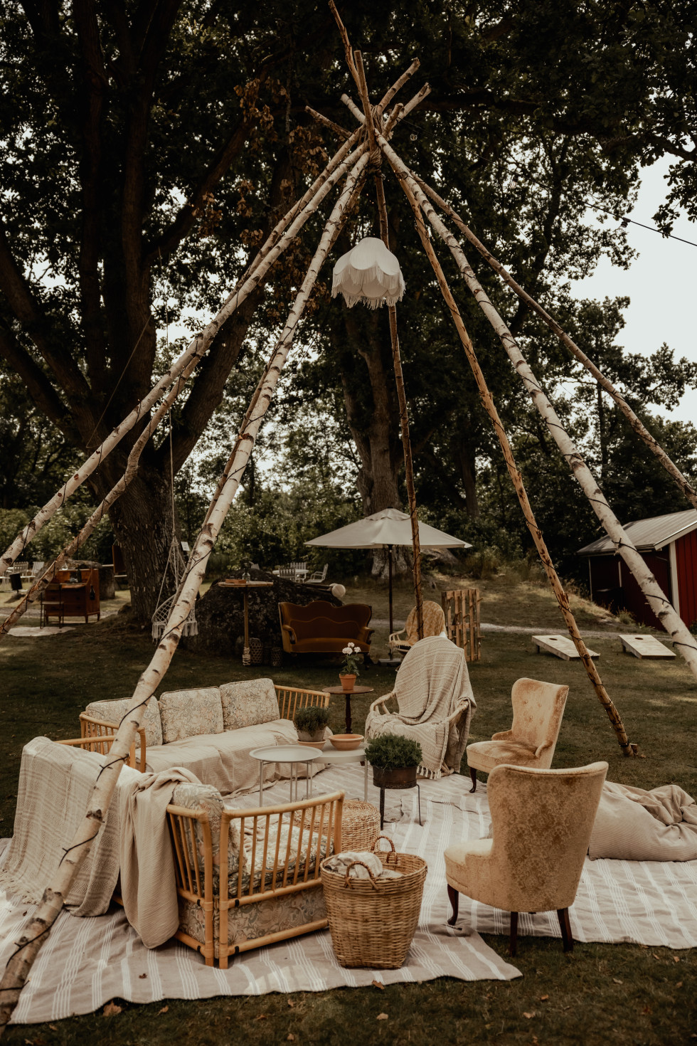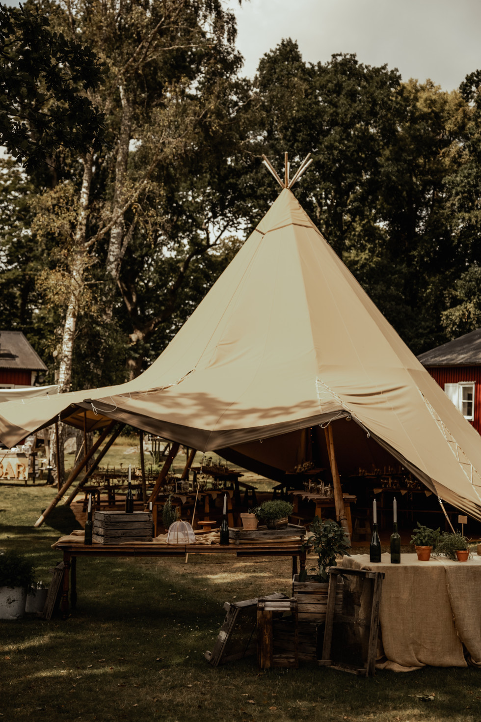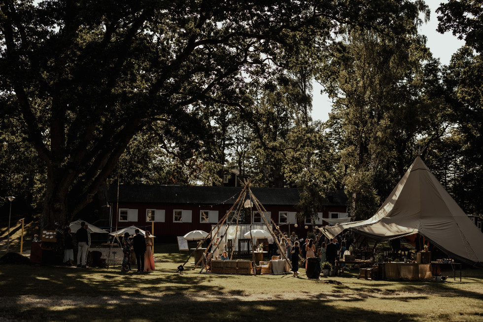 Festen var dock inte lika självklar var den skulle hållas, eftersom lokalens kapacitet var max 60 personer och vi hade bjudit cirka 80 gäster. Vi letade efter utomhusalternativ och fastnade för ett Tentipi-tält, som rymmer mellan 72 och 130 personer beroende på hur det sätts upp. Vi byggde även en ”naken-tentipi” – ett tält utan tyg – som blev en härlig lounge med rottingmöbler och en gammal lampskärm med fransar. Detta skapade precis den bohemiska och mysiga känsla vi ville ha.