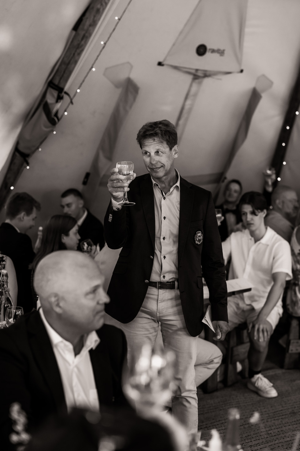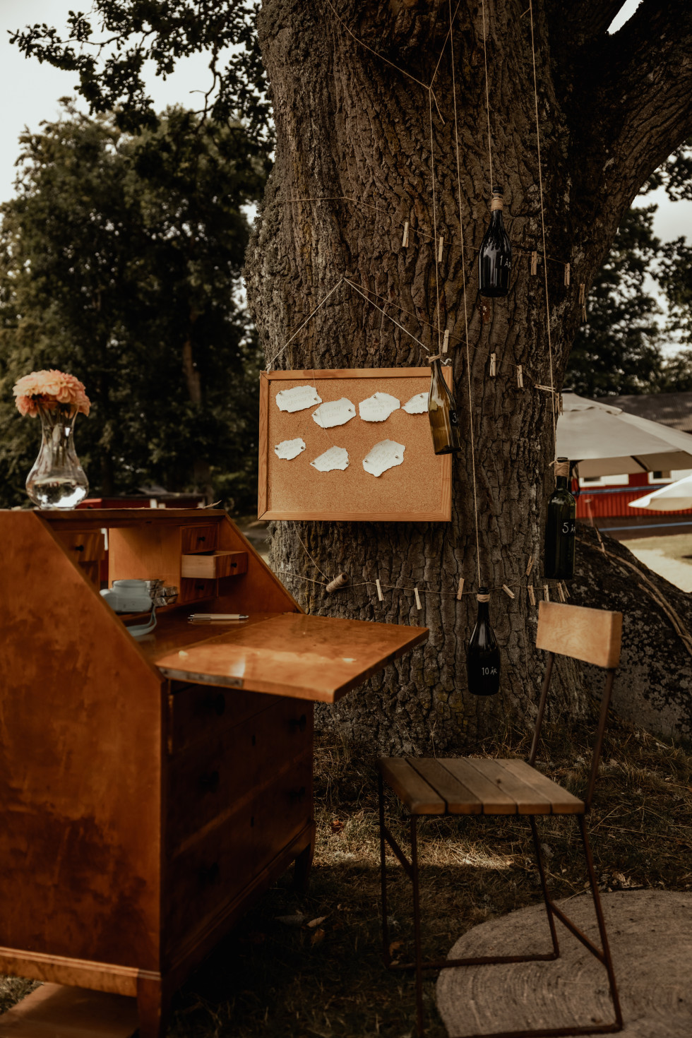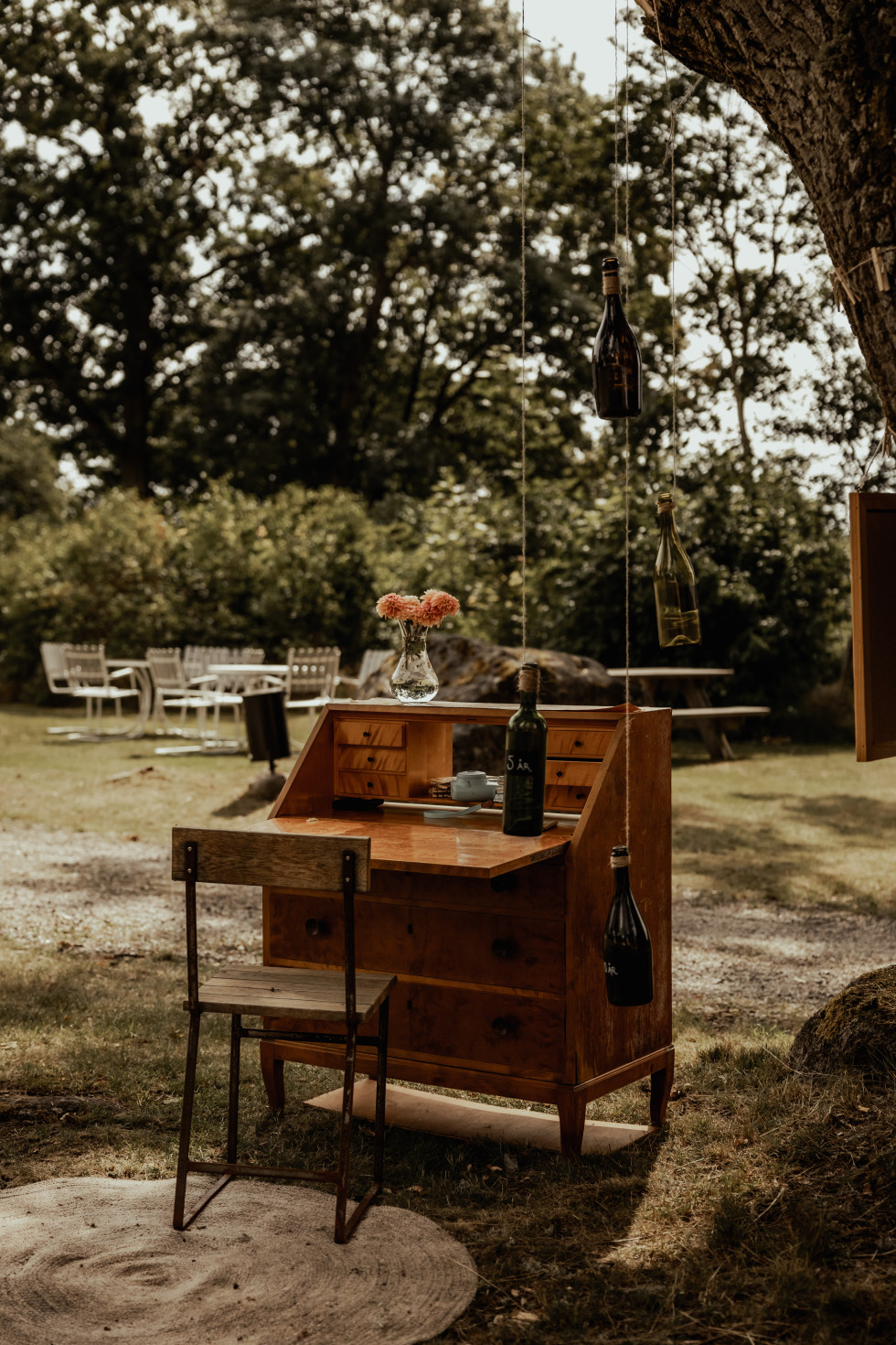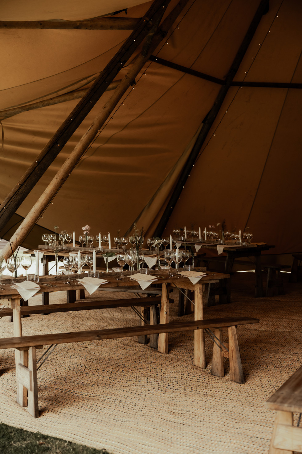 Festen var dock inte lika självklar var den skulle hållas, eftersom lokalens kapacitet var max 60 personer och vi hade bjudit cirka 80 gäster. Vi letade efter utomhusalternativ och fastnade för ett Tentipi-tält, som rymmer mellan 72 och 130 personer beroende på hur det sätts upp. Vi byggde även en ”naken-tentipi” – ett tält utan tyg – som blev en härlig lounge med rottingmöbler och en gammal lampskärm med fransar. Detta skapade precis den bohemiska och mysiga känsla vi ville ha.