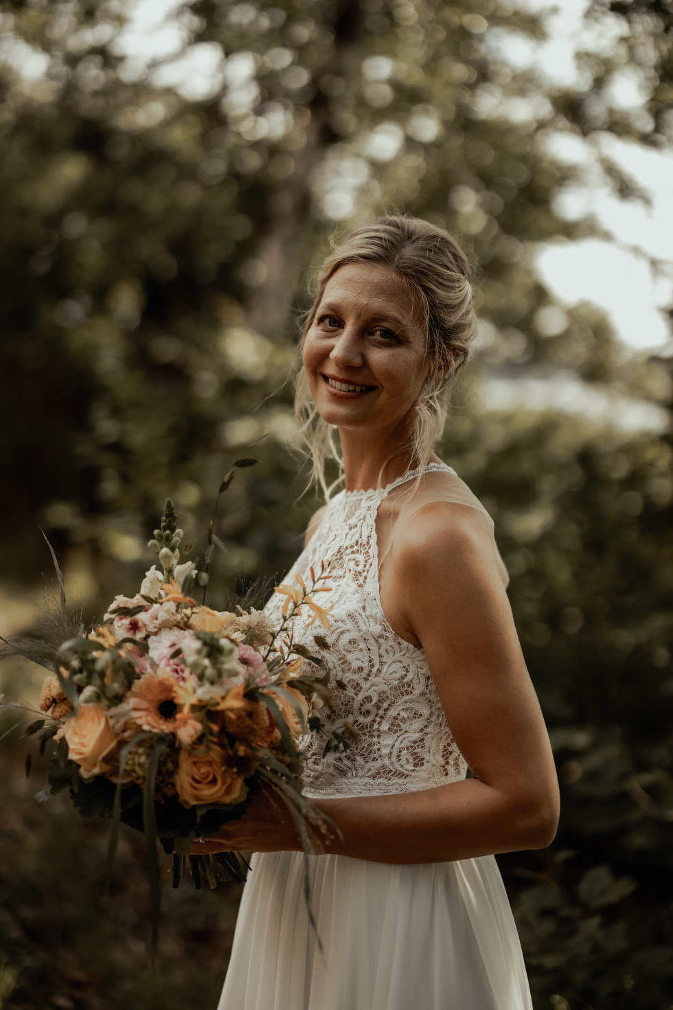 Min bukett var en färgsprakande blandning av aprikos, persika, rosa, vitt och gult, med gröna strån. Mina tärnor bar långa, skimrande sidenklänningar i aprikosrosa, och våra fyra barn var klädda i ljusa beige kläder, med blommor i flickornas hår. De var så otroligt fina!