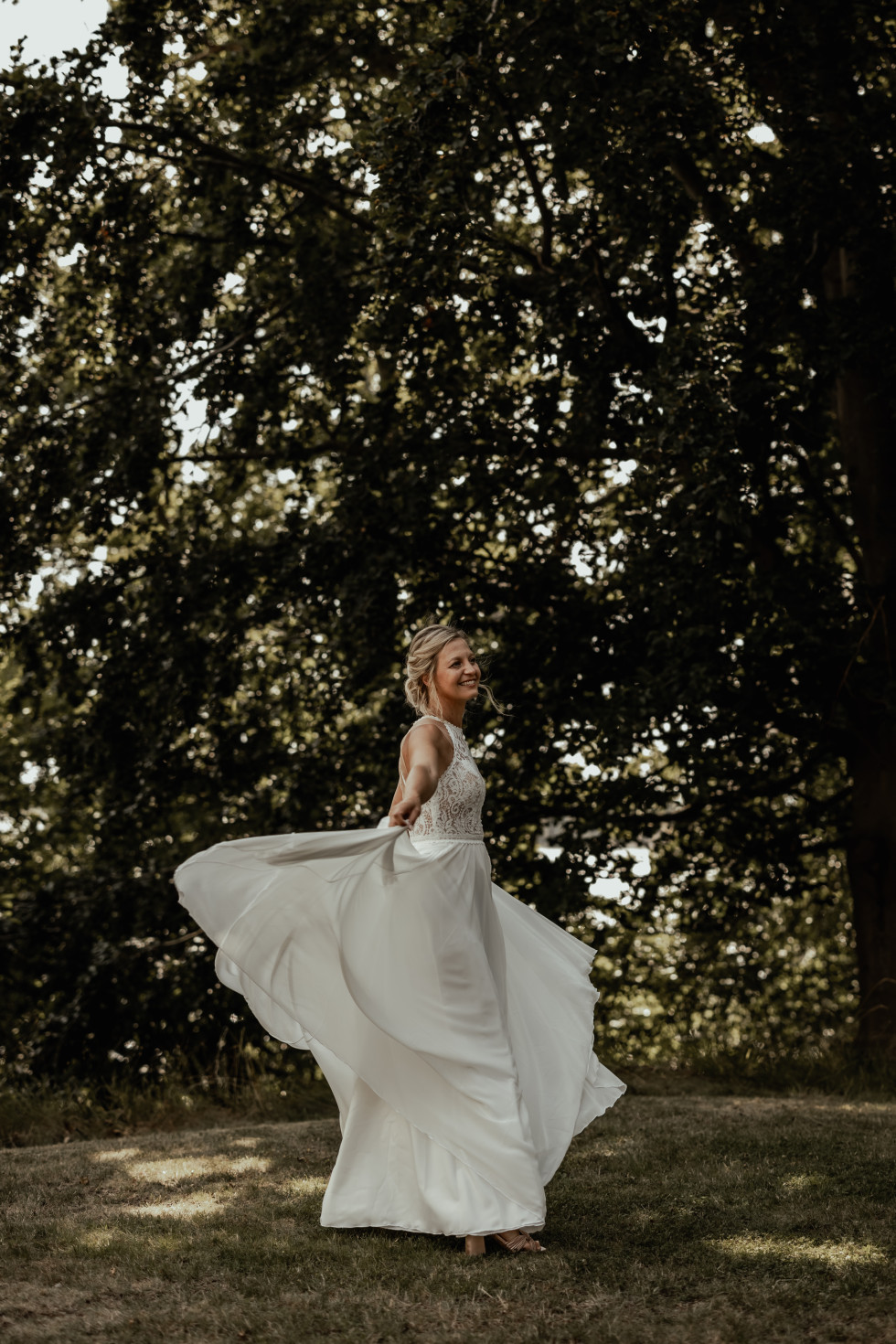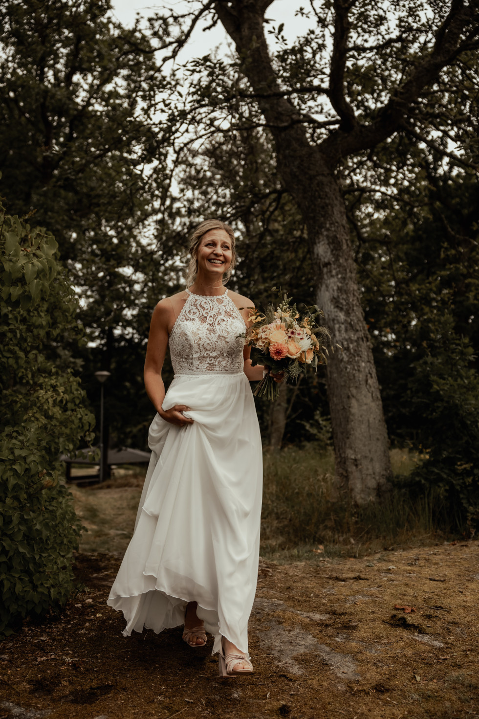 Efter bröllopsdansen bytte jag om till en kortare, långärmad klänning i bohemisk stil, med spets och broderier. Den var perfekt för dansgolvet och hade en underkjol och en genomskinlig överkjol med slits, vilket gav en festligare känsla.
