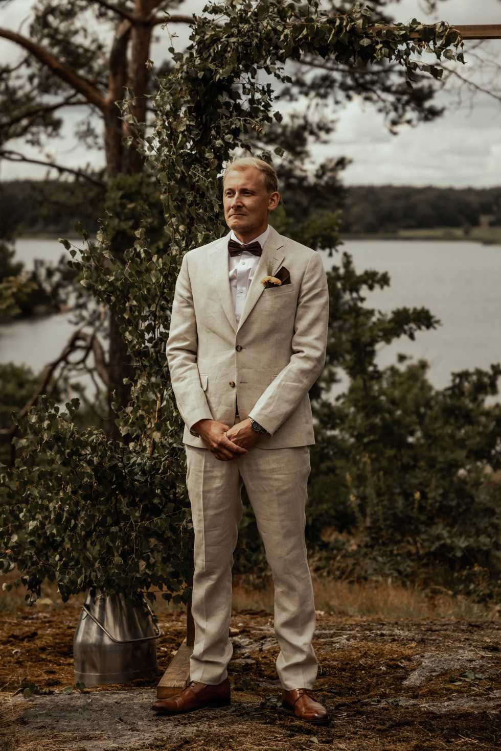 Området kring marinens lokaler är fantastiskt med utsikt över skärgården och stora grönområden. Vi bestämde oss snabbt för att vigseln skulle hållas uppe på en klippa, en borgerlig ceremoni i all enkelhet med vacker sång från Daniels syster Karolina och Karlskronas magiska skärgård som bakgrund. Daniel byggde vår vigselbåge själv, dekorerad med ek- och björkkvistar – en symbol för våra hemtrakter, Umeå (Björkarnas stad) och Blekinge (där ek är landskapsträdet). Våra barn fick viktiga uppdrag under vigseln; Viggo och Olle bar ringarna, och Meja och Ellie strödde blomblad.