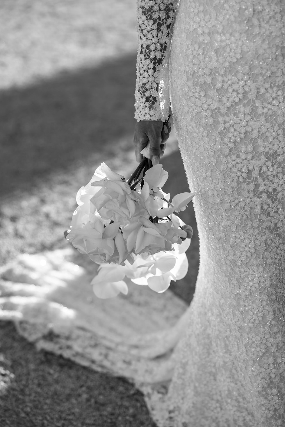 En brud håller sin bukett nära, en symbol för den stora dagen.