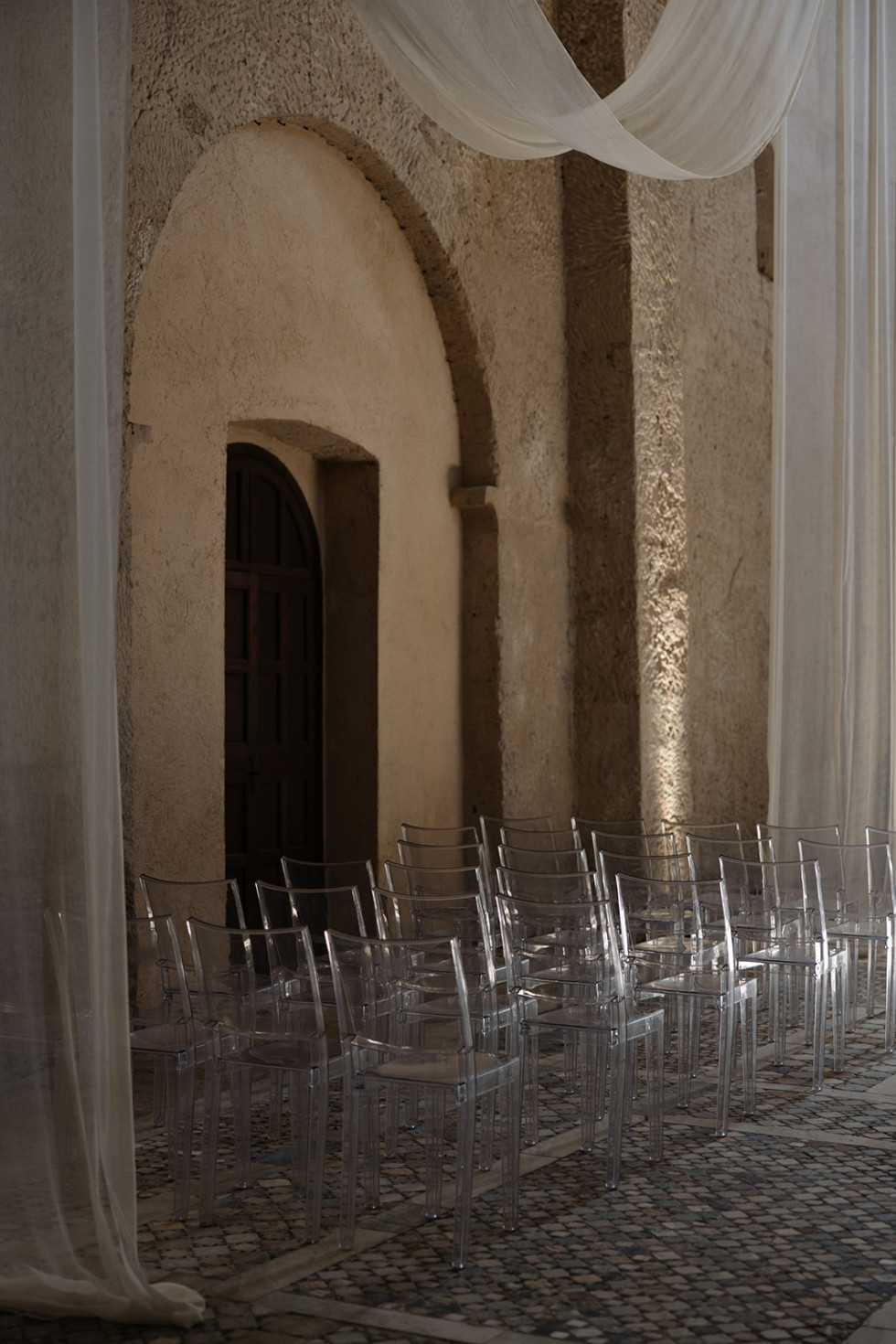 Transparenta stolar bidrog till en stilren och luftig look, vilket gjorde att lokalens naturliga skönhet verkligen fick ta plats. Genom att använda genomskinliga element skapades en illusion av rymd och lätthet, något som förstärkte den moderna och eleganta känslan. Mjuka tygdraperingar i taket svävade försiktigt över rummet och tillförde en drömlik dimension, vilket skapade en intim och inbjudande miljö där gästerna kunde känna sig omslutna av en varm och romantisk stämning.