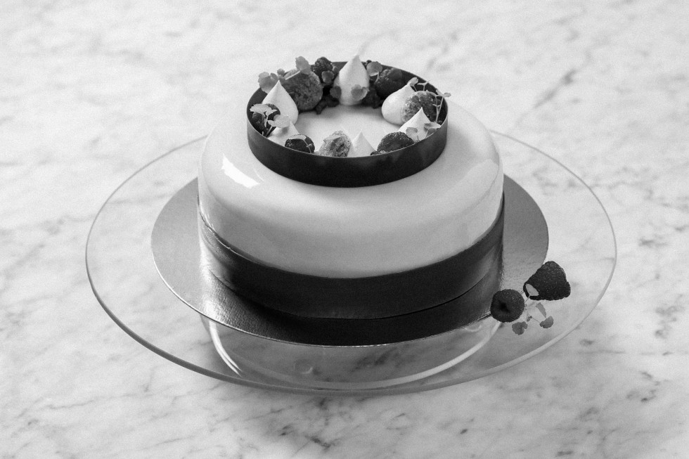 Chokladband nere: Klipp ett plastband som räcker runt tårtan. Smält Valrhona hallonchoklad och stryk på plastbandet. Vänta till chokladen börjat sätta sig och lyft sedan bandet och sätt i nederkant av tårtan. Chokladring: Klipp ett plastband ca halva längden. Temperera chokladen, stryk tunt på plastbandet och forma till en ring. Lägg på chokladringen på tårtan och spritsa i dulceykrämen, strö wetprof hallon, lägg färska hallon och avsluta med Atsina.