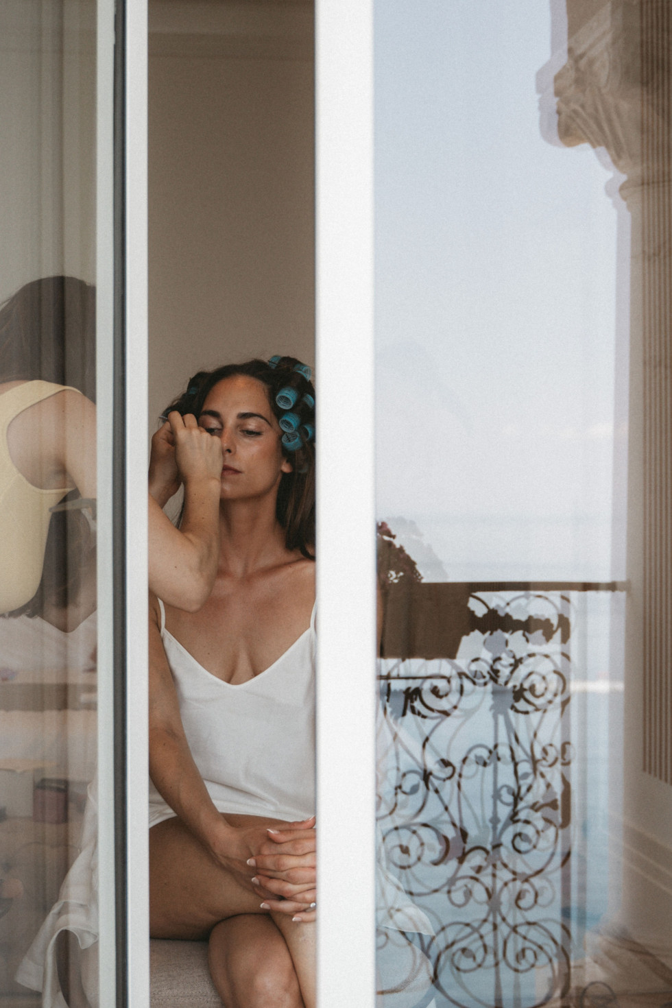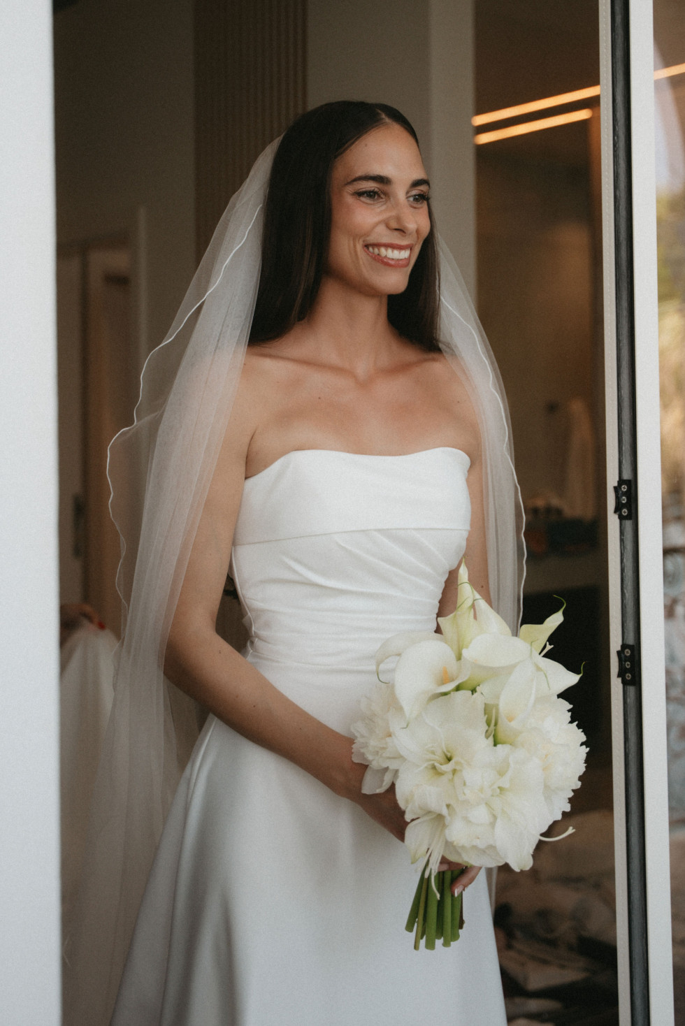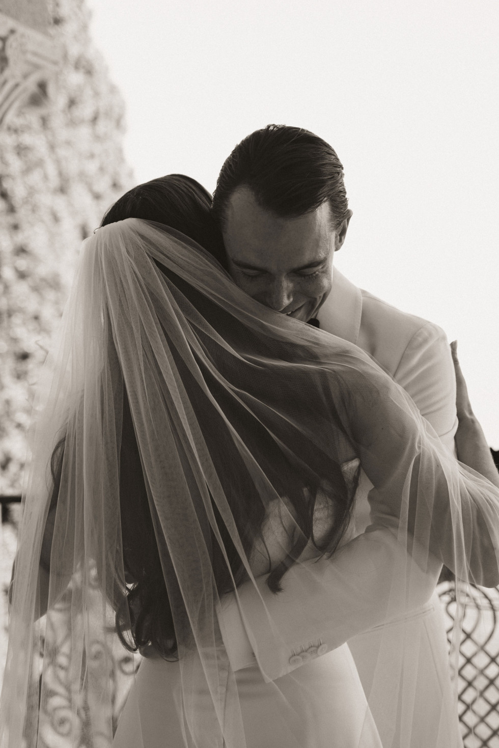 Innan gästerna hade satt sig tillrätta och musiken började spela, tog Sasha och Emil en stund för sig själva. Deras first look utspelade sig i en stillsam korridor med utsikt över havet, inramad av pelare och arkitektoniska detaljer. Det var ett ögonblick som pausade tiden. Två personer, mitt i sitt livs mest betydelsefulla dag, som valde att mötas i lugnet innan allt satte igång.