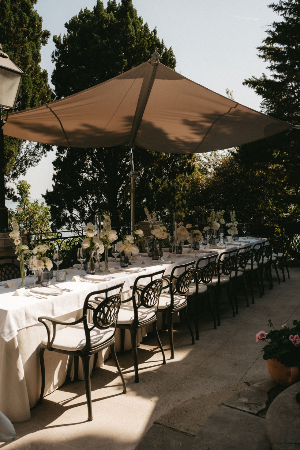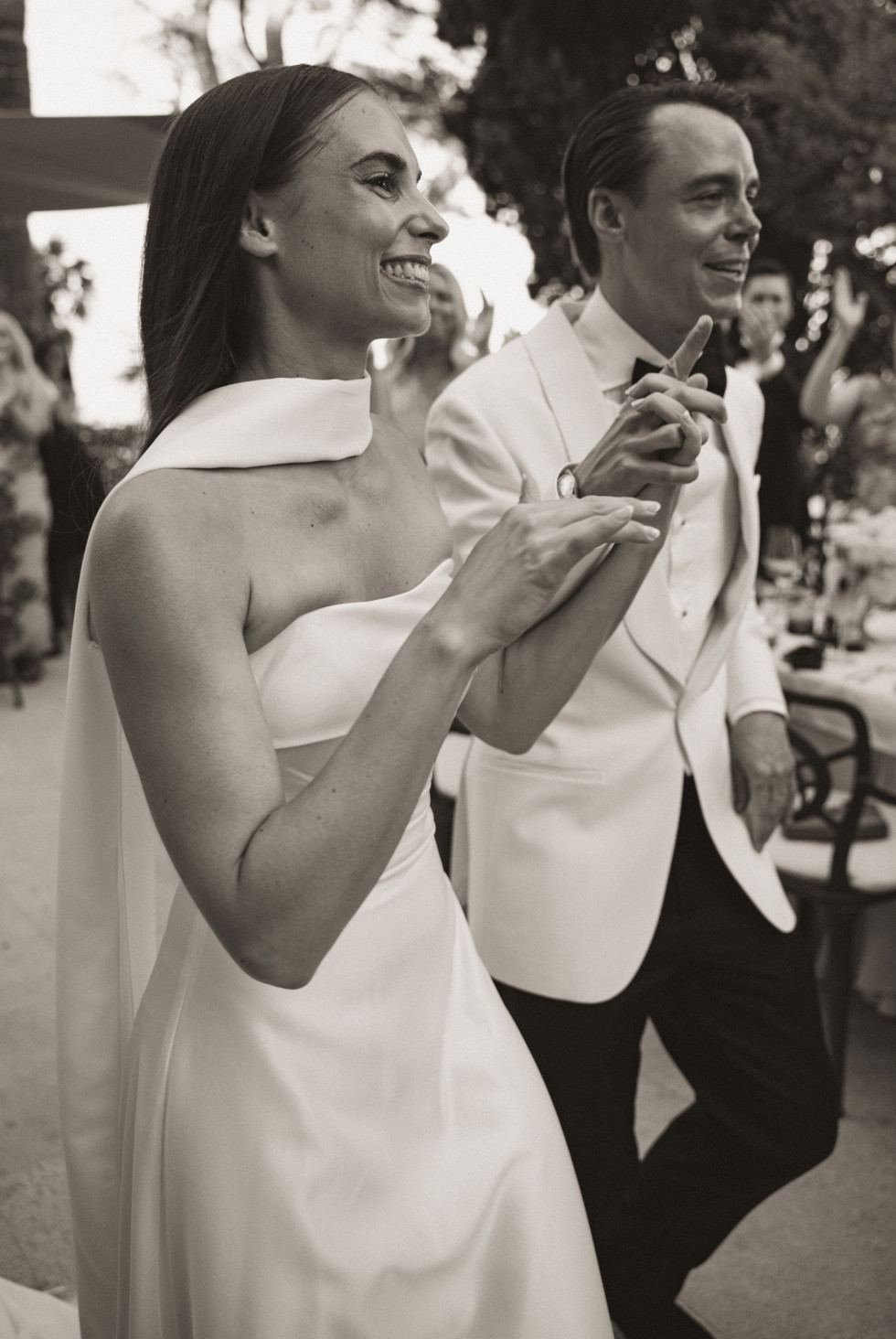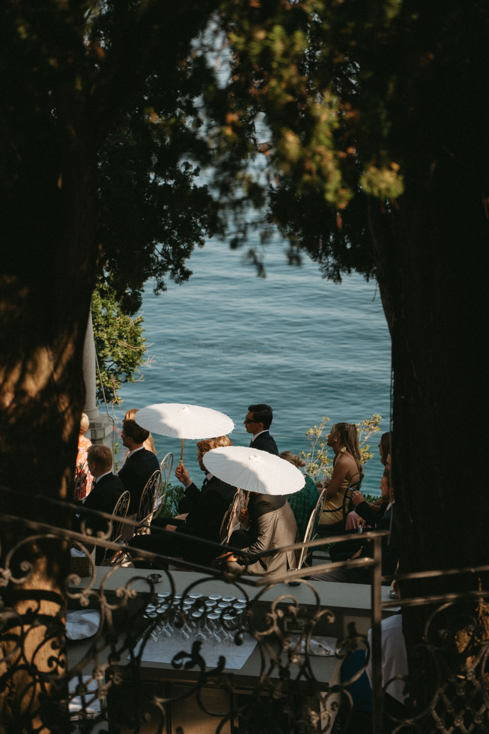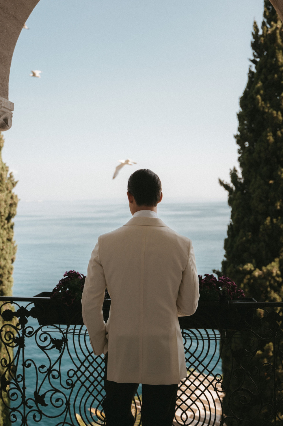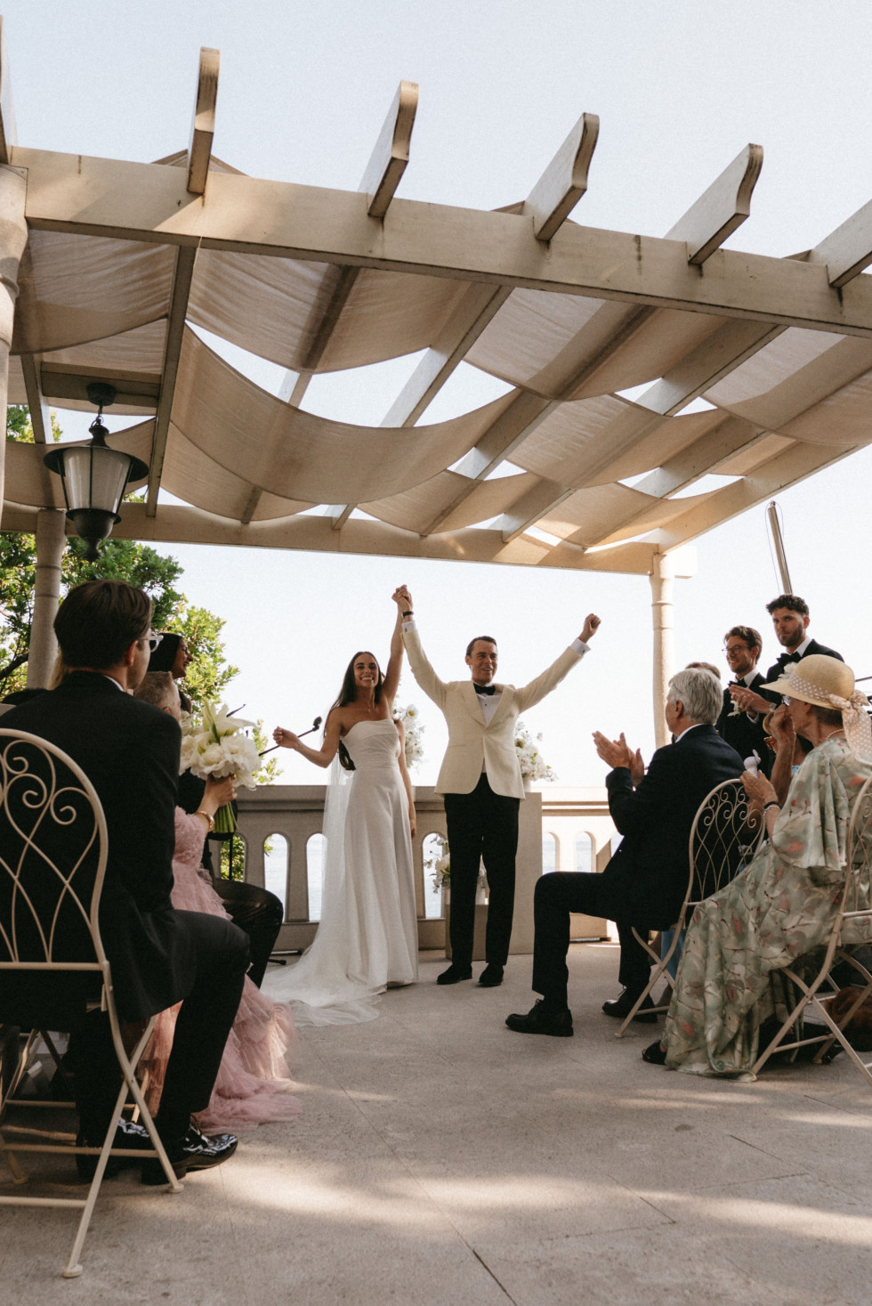 Platsen där Sasha och Emil lovade varandra evig kärlek var lika imponerande som intim. En terrass högt över klipporna, med utsikt över det glittrande vattnet. Gästerna satt i skuggan, några med pappersparasoller i händerna och lyssnade på löftena som ekade mellan pelare och pinjeträd. Emil i vit smoking, Sasha i en elegant och minimalistisk klänning med skulptural halsringning.