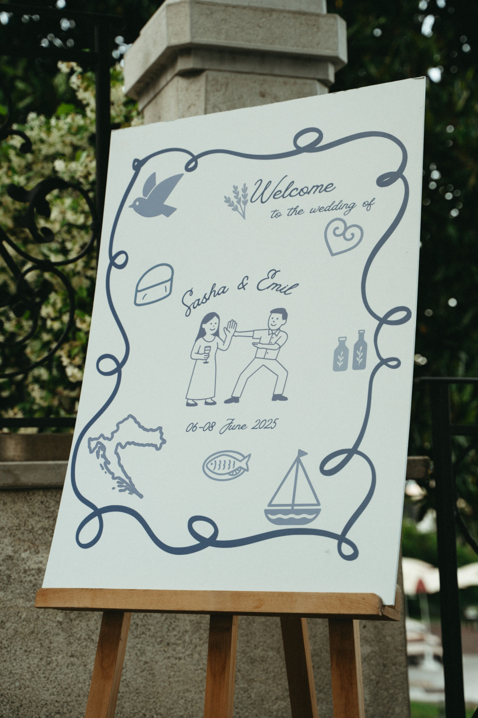 Kvällen fortsatte med middag vid långbord under träd och parasoll. Bordet var klätt i vitt linne, med vita blommor och levande ljus. Gästerna åt rätter inspirerade av det lokala köket, färska råvaror, olivolja, vin från trakten och samtalen flödade i takt med vågornas brus. En särskilt charmig detalj var välkomstskylten – lekfull med symboler från parets resa. Den påminde alla om att det här inte bara var en vacker dag, utan också en personlig berättelse.