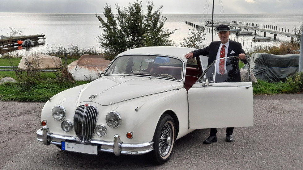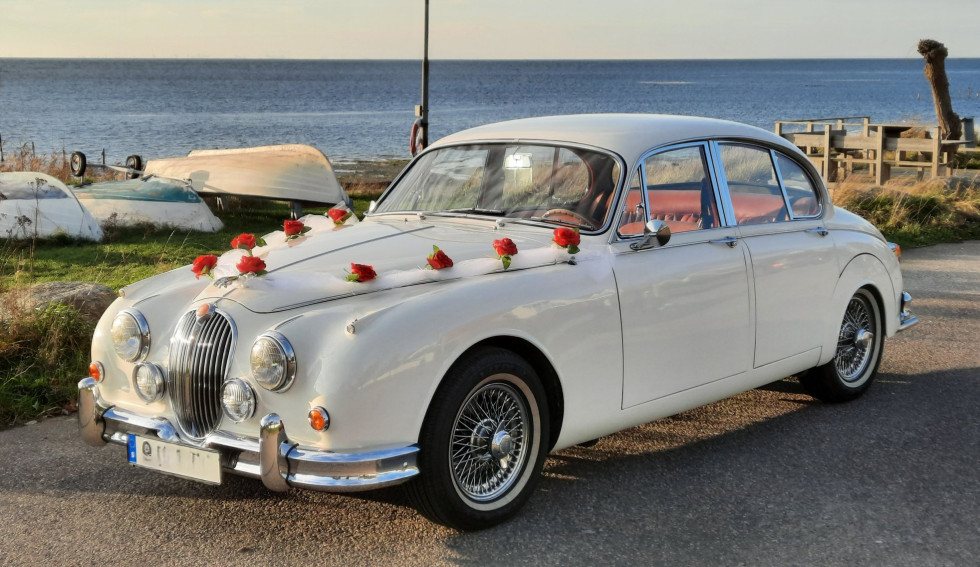 Min bil är en vit Jaguar Mark2 från 1962 i nybils-skick.