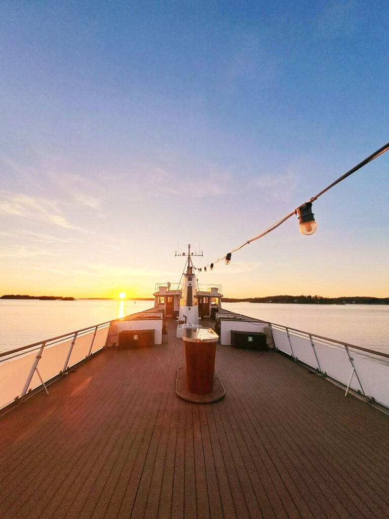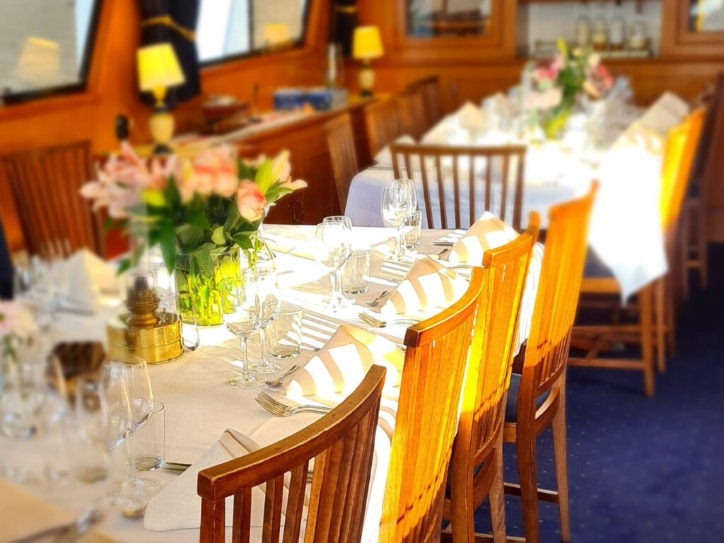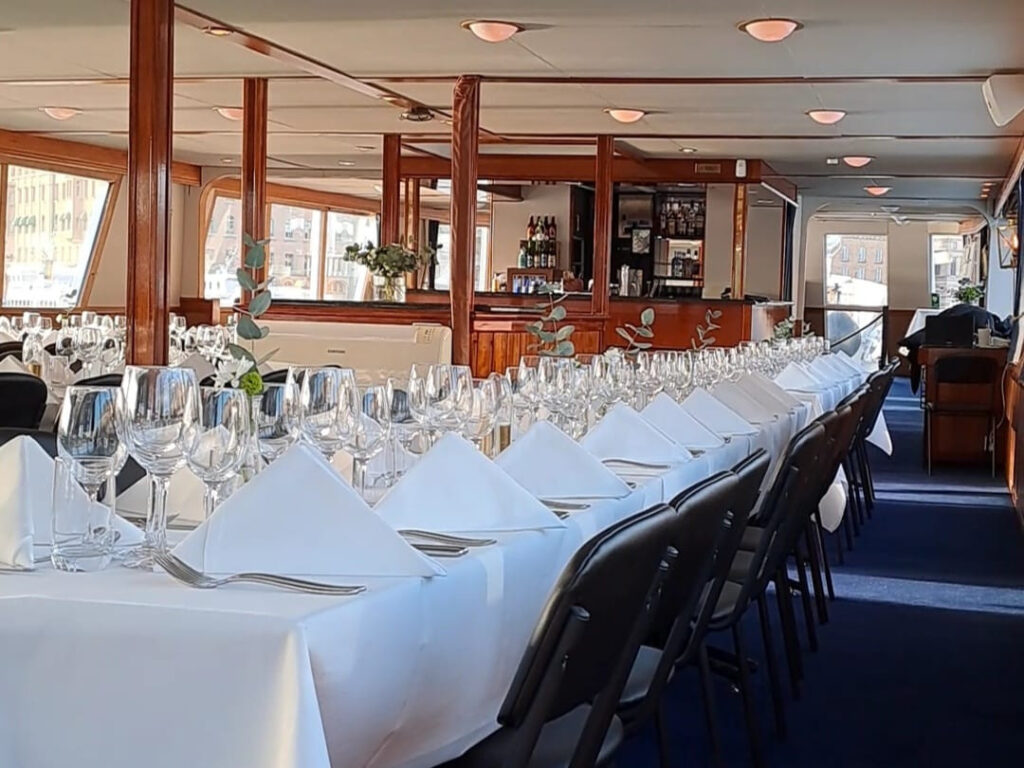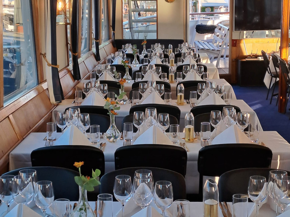 Vi formar er stora dag efter era önskemål och ser till att när väl dagen är här flyter allting på som det ska, så ni kan fokusera på era nära och kära. Väl ombord kan ni ta en bröllopsskål på soldäck till tonerna av vår pianist. När det sedan blir dags för middag tar ni er en trappa ner till salongen och avnjuter en härlig 3-rättersmiddag med väl utvalda viner. För att avsluta med en kaffe och avec i baren innan kvällens dans börjar.