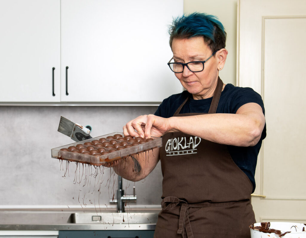 Chokladtanten Efter åratal av administrativt arbete var det dags att ta sig ur ekorrhjulet. Av en slump hamnade jag i chokladens magiska värld. ​Ett par kurser i pralintillverkning på bl.a. Nora Chokladskola och praktik hos några av Mälardalens största chokladdrottningar och jag visste att jag hittat rätt. Jag återfann min estetiska ådra och gav mig hänryckt in i smakernas värld. Aldrig mådde jag så bra i själen som när jag var i pralinköket. Efterfrågan på mina praliner ökade bland vänner, bekanta, vänners vänner och bekantas bekanta. Till slut kände jag att jag måste satsa på skapandet av dessa fantastiska drömmar i choklad och drog igång Chokladtanten. Mina chokladverk är hantverksmässigt tillverkade med en stor portion kärlek. Råvarorna är, så långt det är möjligt, ekologiska och närproducerade. Det är en konst att ta fram recept på fyllningar! Det handlar om kemi för att fyllningarna ska få hållbarhet utan en massa tillsatser. Efter att ha gått kurser i receptberäkning, både irl och web-baserat (under pandemin), så kan jag garantera åtta veckors hållbarhet från tillverkningsdatum. Jag heter Lena Orsin och är Chokladtanten som lever ut min dröm i chokladens magiska värld!