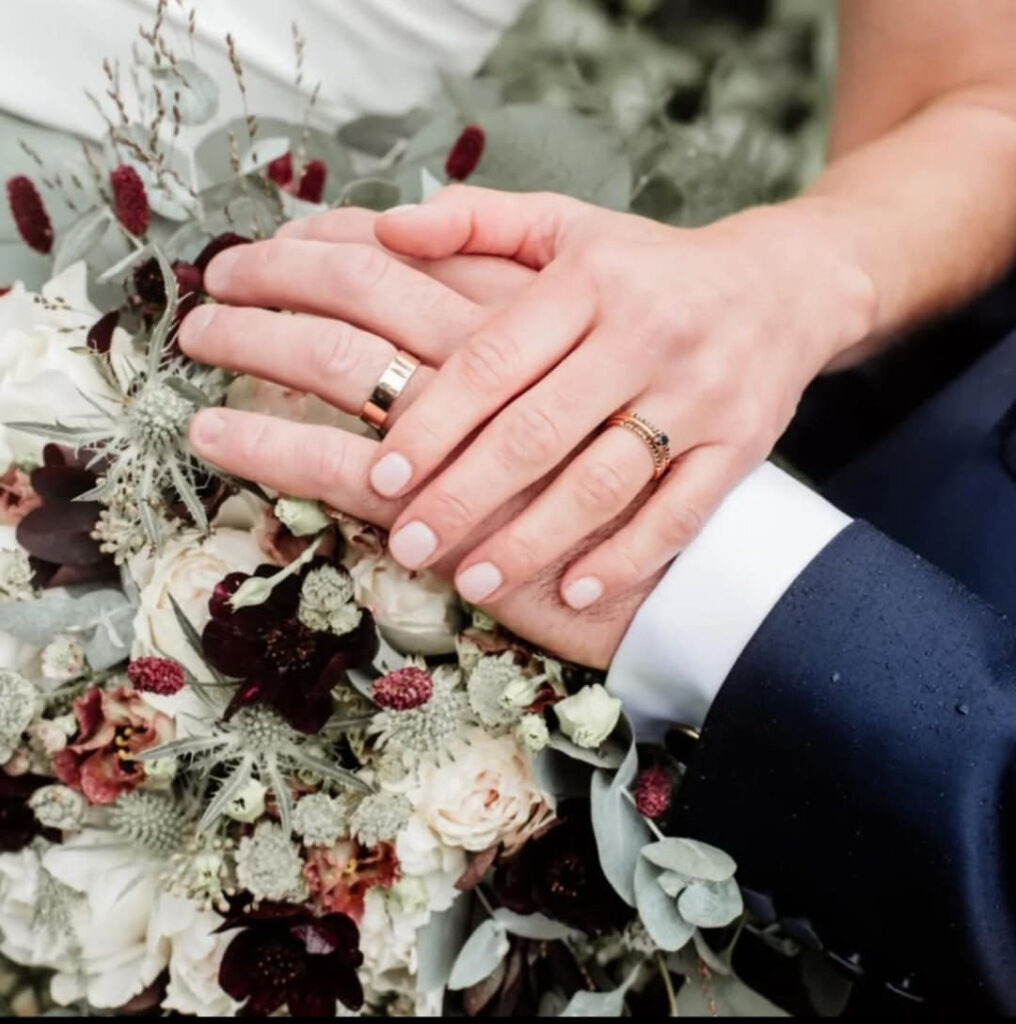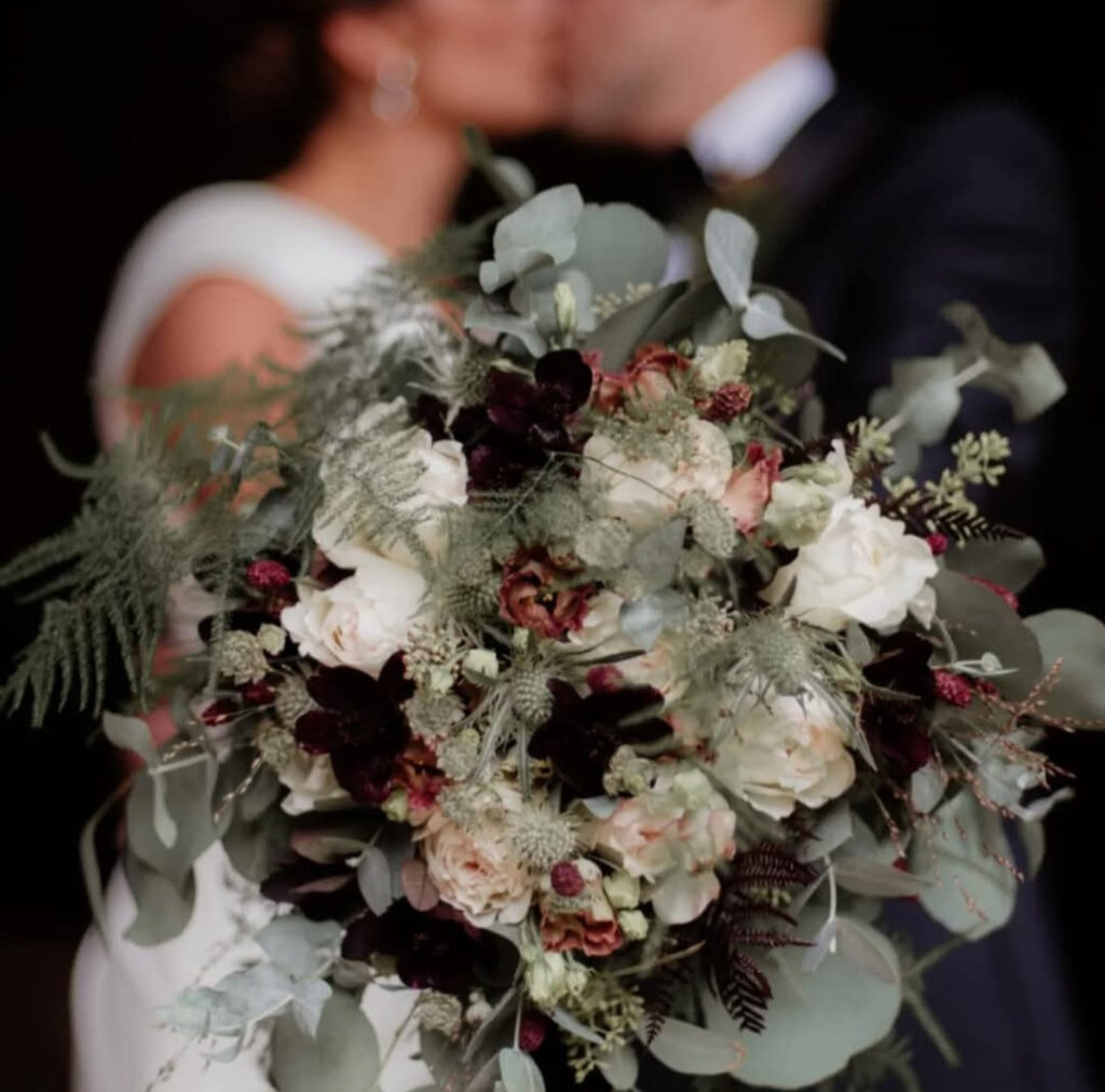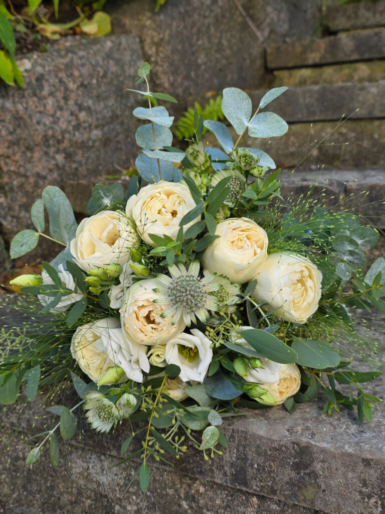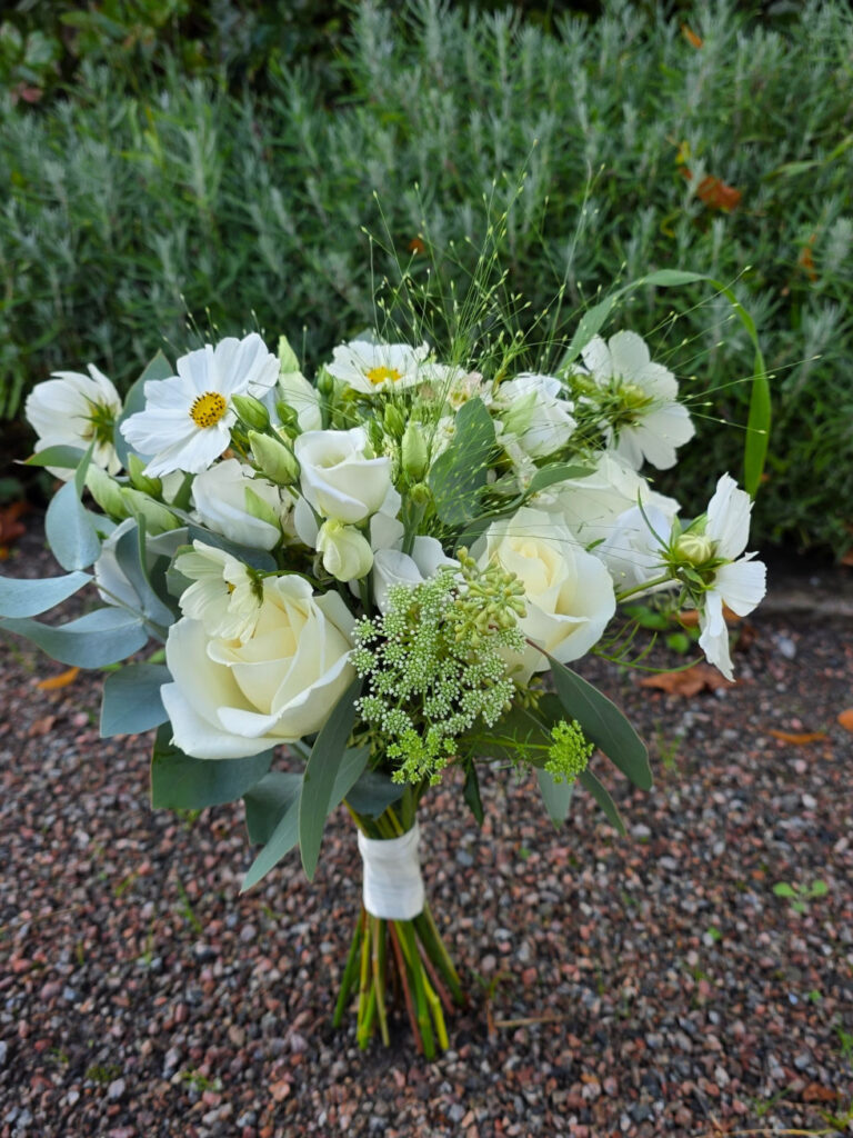 De brudbuketter vi gör är alla handbundna. Vi väljer att tänka hållbart så vid önskemål av en droppformad bukett använder vi metallnät istället för stickmassa.