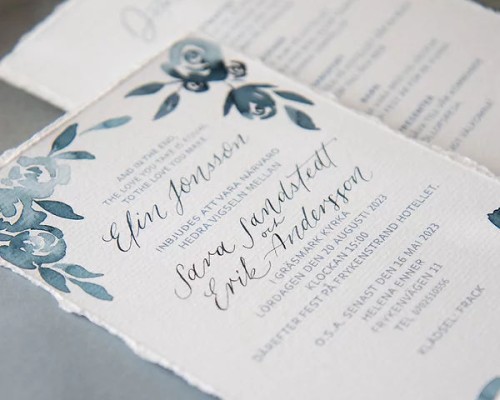 Underbara, personliga, handgjorda och handmålade kort till ditt bröllop, fest eller dop! Varje inbjudan är ett hantverk. Jag skriver för hand den finaste kalligrafi stilen, river kanterna, målar akvarell och med mycket kärlek för detaljer får ni de perfekta inbjudningar till er dag. Jag kan även göra illustrationer, t ex er bröllopslocation. Välj en design som passar er ur mina kollektioner. Eller om ni vill ha någonting alldeles eget kontakta mig via mail till hej@juliettesatelier.se.