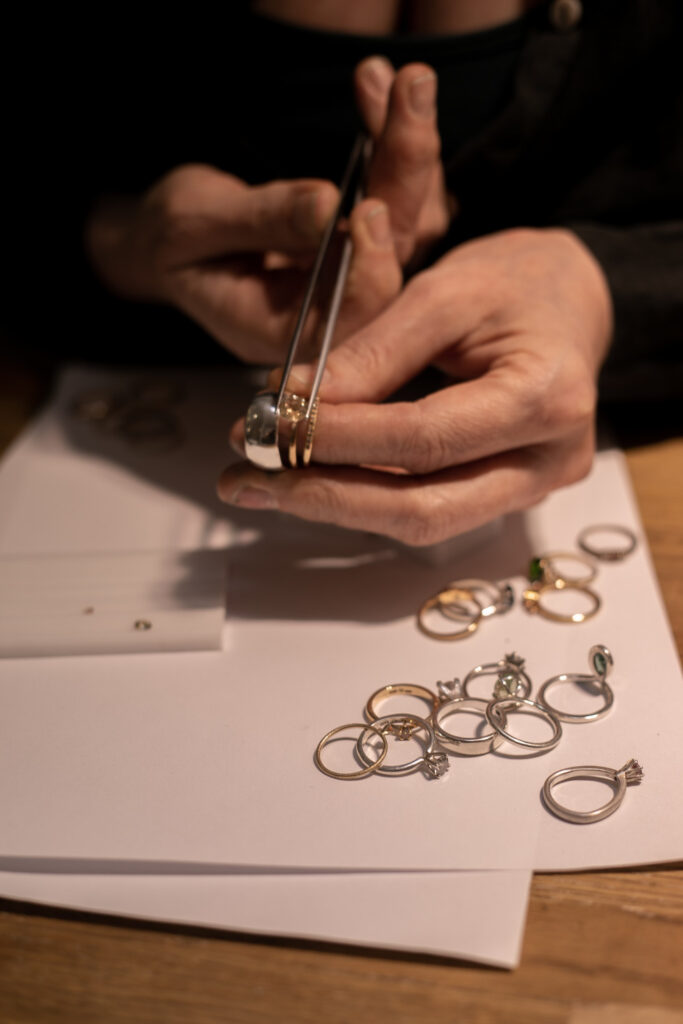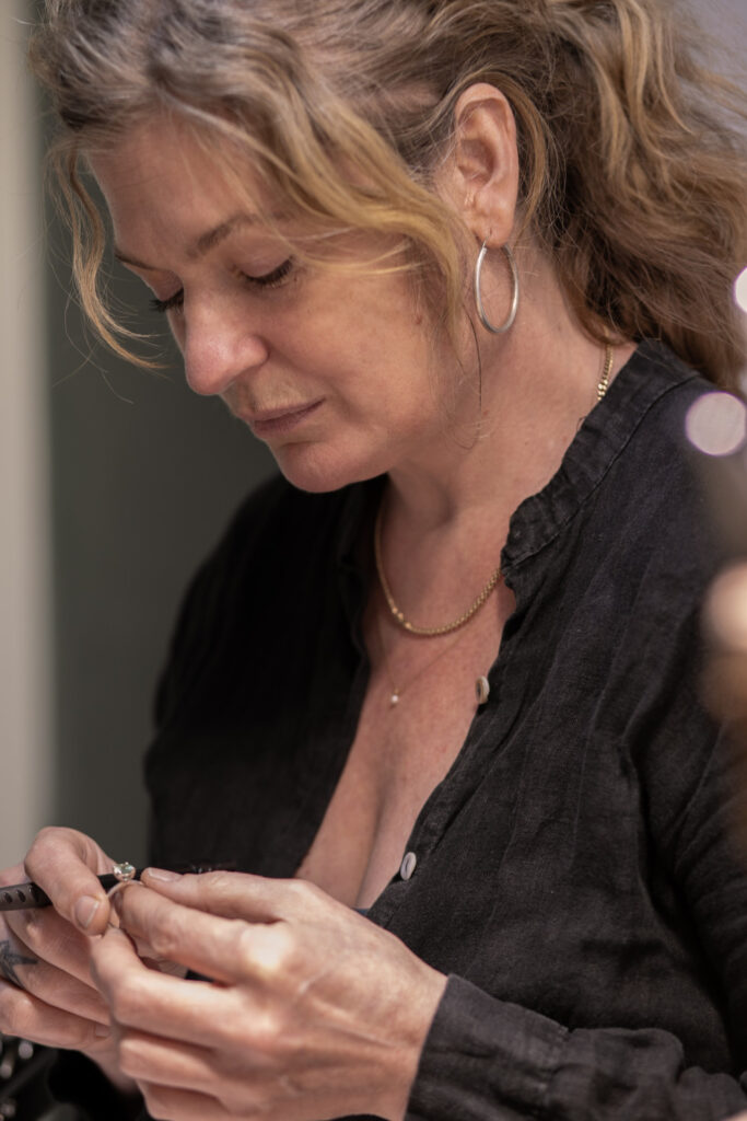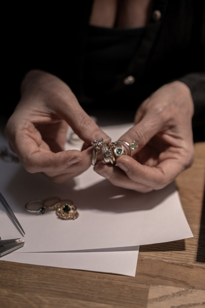 Kom till mig för att göra era ringar. Kanske har ni en fast ide. Kanske har ni en inspirationsbild eller så är ni helt clueless. Eller lite av allt. Men jag tar hand om er. I min verkstad på söder i Stockholm möts vi. Ni får se mina provringar. Mina modeller. Ni provar och känner efter. Vi tittar på stenar och provar former. Ser färgen på metallen och hur stenar skimrar och gifter sig med guld eller mot din hand.