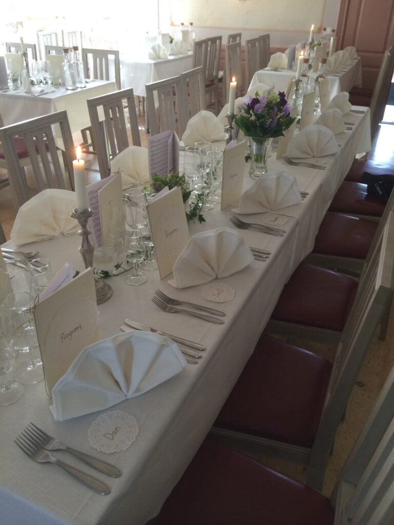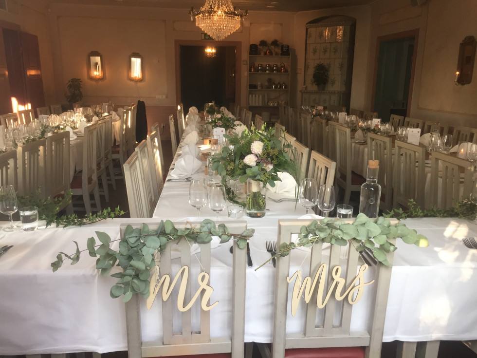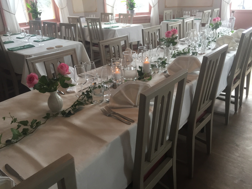 För att göra er dag så fantastisk som möjligt krävs det planering. Den gör vi tillsammans i förväg. Många väljer att viga sig på Herrgården. Man kan då boka egen vigselförrättare och ha cermonin här. Om vädret tillåter i trädgården, tex vid lusthuset. Annars på t ex övervåningen med sina härligt vitmålade stockar och fina målningar. Vi skräddarsyr dagen efter era önskemål vad gäller mat, dryck, upplägg, färger på blommorna på borden (enkel blomma ingår) – till hur mycket dryck ni står för innan gästerna välkomnas till baren för att köpa det som önskas utöver. Då dagen för bröllopsfesten kommer kan ni känna er fullkomligt trygga med att vi fixar allt, ni kan lugnt njuta av er dag och era gäster.