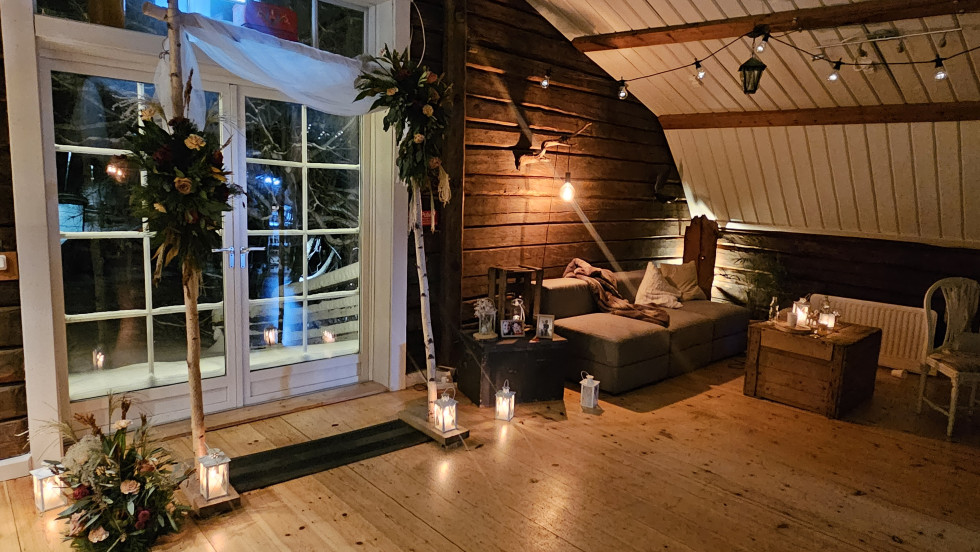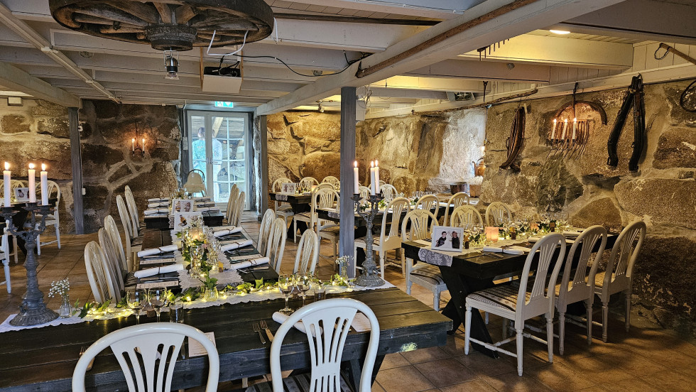 Logen: som är vår stora festlokal rymmer 80 sittande gäster och 70 gäster vid sittande bord i vår mysiga restaurang i stenladugården. Har en serveringsbar på vardera våningsplan. Nedre plan har metertjocka stenväggar och på övre plan är det timrade väggar och eldstad. Inredningen är rustik och lokaler samt utomhusmiljöer passar både för vinter- som sommarbröllop. Ni har alltid ensamrätt till lokalerna samt hela utomhusmiljön vid bröllopsarrangemang.