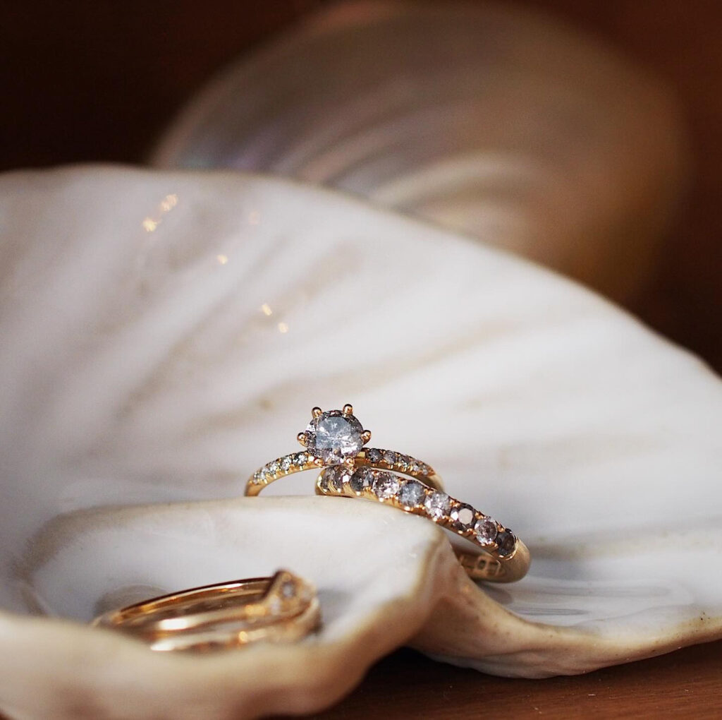 Förlovnings- och vigselringar, gnistrande salt- & peppardiamanter, ljuvliga champagnediamanter, svarta diamanter med djup och kontrast. Eller varför inte bländande vita diamanter? Våra förlovningsringar och vigselringar är varsamt tillverkade i 18k guld och infattade med olika ädelstenar. Att välja ringar till förlovning och vigsel kan kännas som ett stort beslut. Vi hjälper er gärna att hitta rätt och kan också specialtillverka utifrån specifika önskemål.