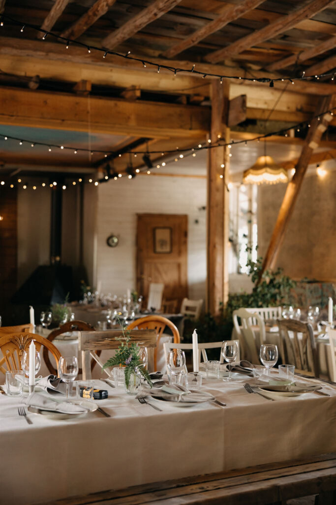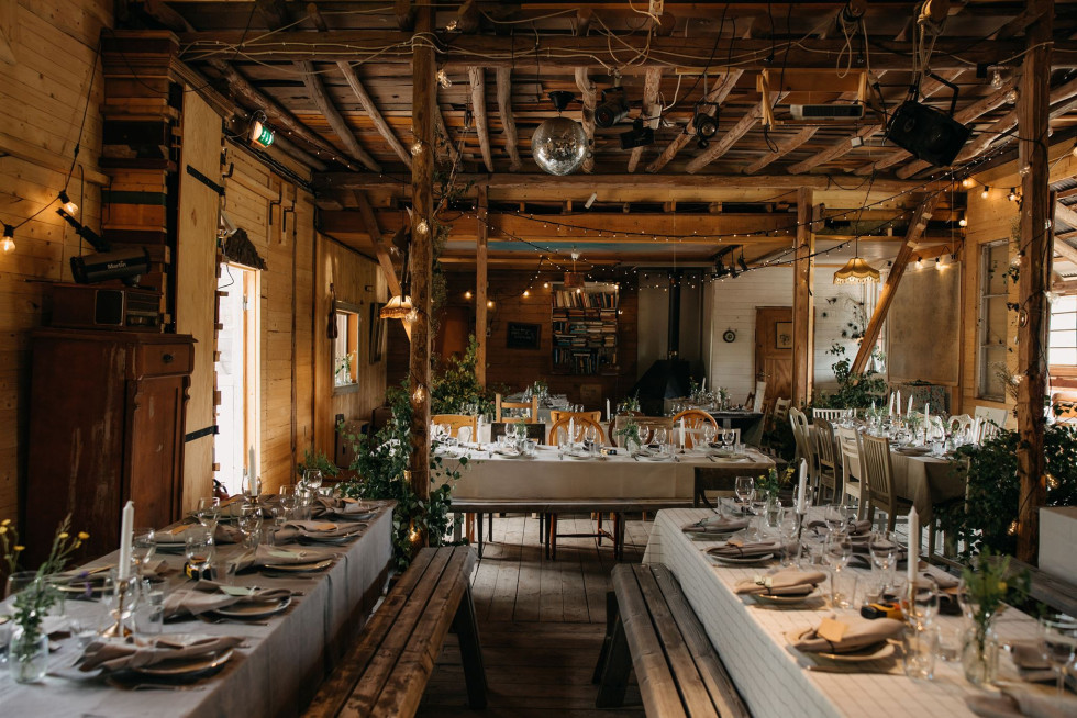 Långbord och bänkar placeras i logen för att få plats med alla gäster. Vår unika grundinredning står till er förfogande och ni är välkomna att sätta er egen prägel på rummet.