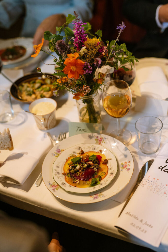 17:00 – 18:15 Brudskål med mingelmat på gårdsplan framför festlokalen med bubbel och snittar. 18:15 Gästerna börjar sätta sig ner.