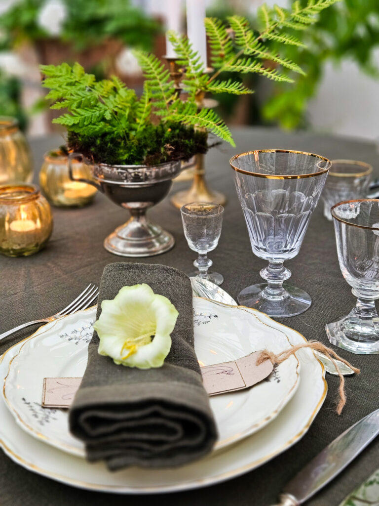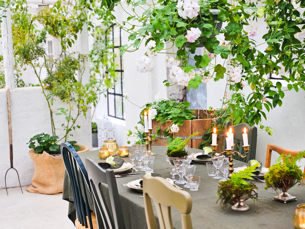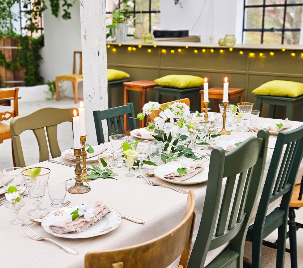 Då vi vill skona miljön satsar vi på återbruk så gott det är möjligt. Därför kommer ni finna att både möbler och porslin är olika, men ändå hör ihop. Stilen är bohemisk, varm och rustik och går i naturens färger; grönt, beige och brunt. Med diverse olika kuddar, plädar, ljusstakar och lyktor kan stilen dras åt olika håll.
