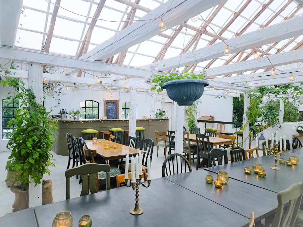 Vi hyr ut Orangeriet för bröllop och fest under sommarmånaderna. Orangeriet är från början en gammal stallänga som fått nytt tak och nygamla gjutjärnsfönster. Ljusinsläppet är fantastiskt och innanför väggarna blandas frodig växtlighet med bord och stolar, en bar och två soffgrupper.