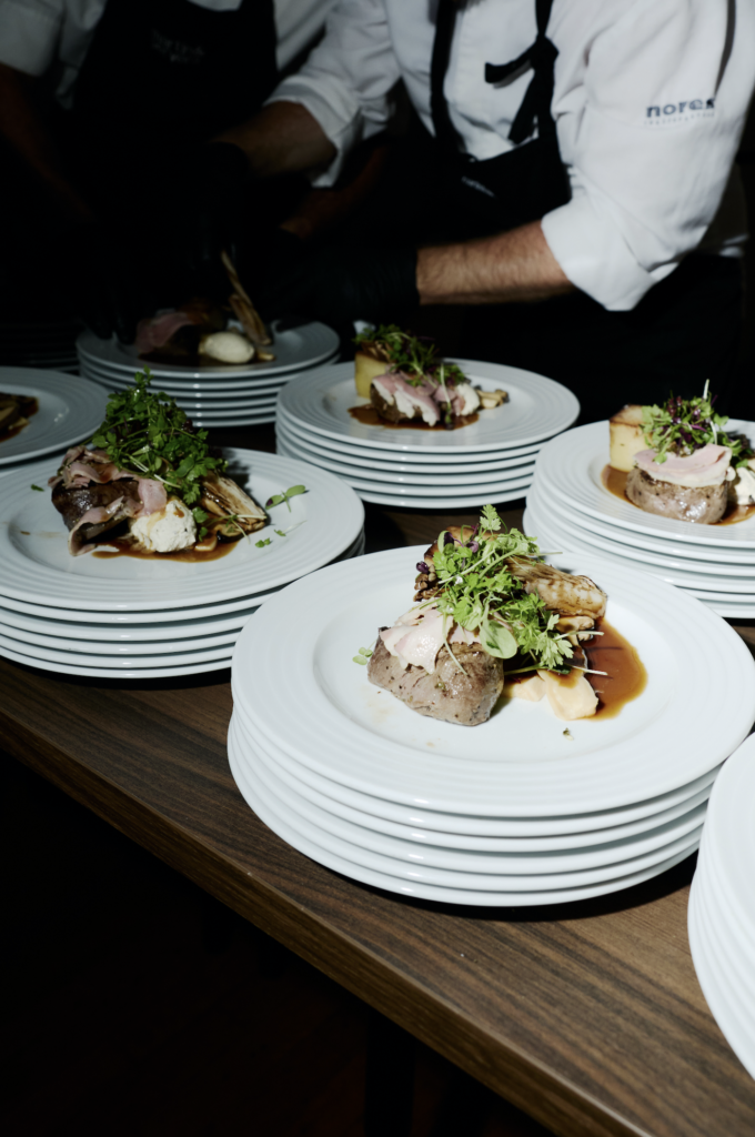 Grillad oxfilé med grönpepparsås och tomatconcasse med västerbottenostkaka.