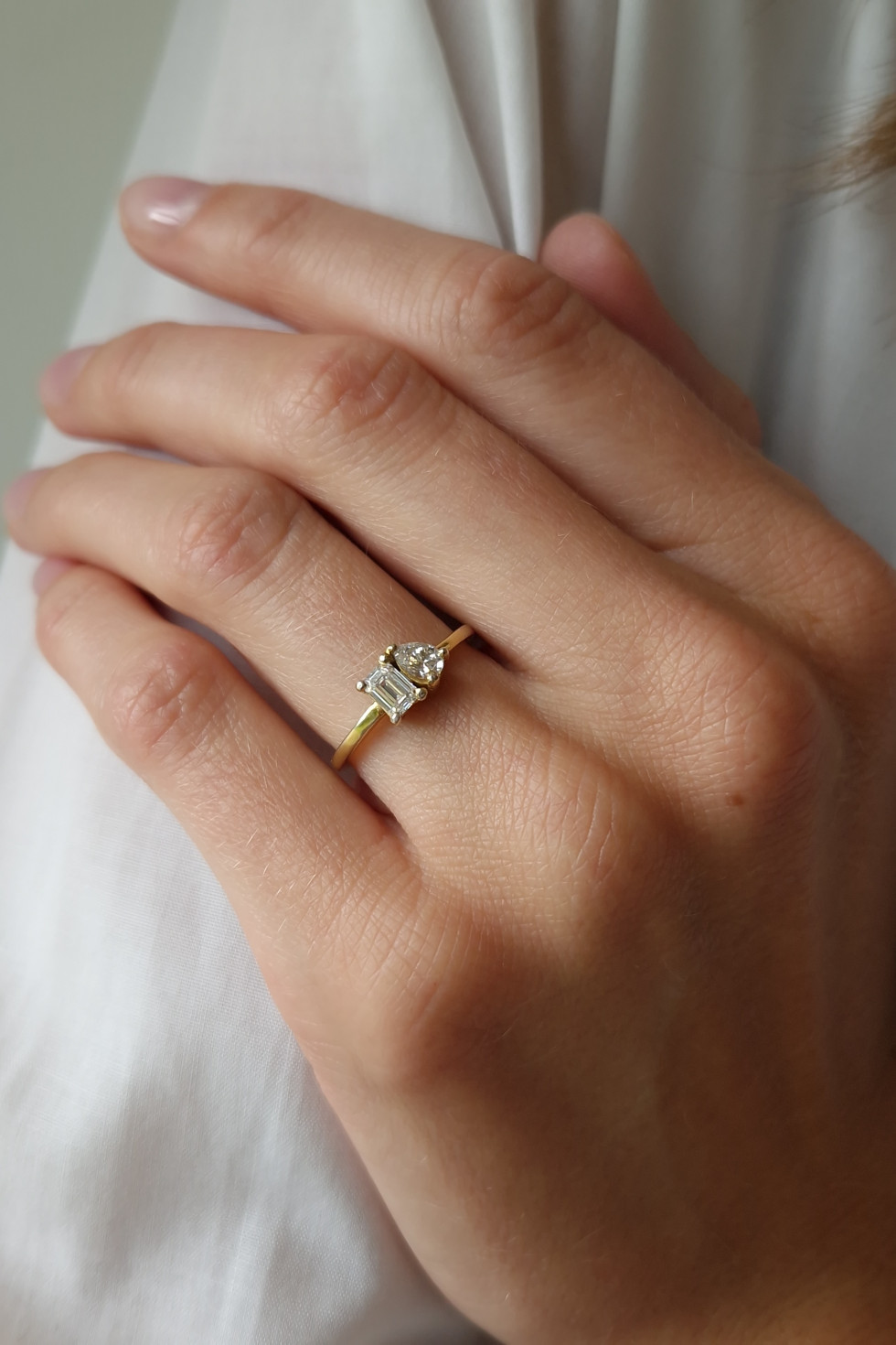 -Den klassiska runda, briljantslipade diamanten är för många det självklara valet när det kommer till att välja sten till förlovningsringen, men vi ser en trend där allt fler väljer andra former för att få förlovningsringar med ett mer personligt uttryck. De former som kommer starkast är ovala och smaragdslipade diamanter, men vi kommer troligtvis också se mer av päronslipade och navettslipade stenar. Vi ser också ett ökat intresse för tvåstensringar, så kallade ”Toi et moi” och då gärna med olika former på diamanterna.