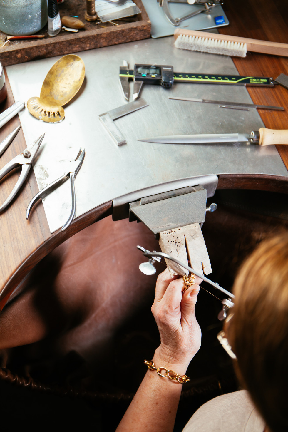 Jag arbetar huvudsakligen med olika guldtyper som rose guld, vitguld, gulgrönt guld, och mellanrött guld, alltid i 18 karat. Silver rekommenderar jag inte på grund av snabbt slitage och kostnadsaspekter. Platina är också ett alternativ, även om det kan vara något mer komplicerat.